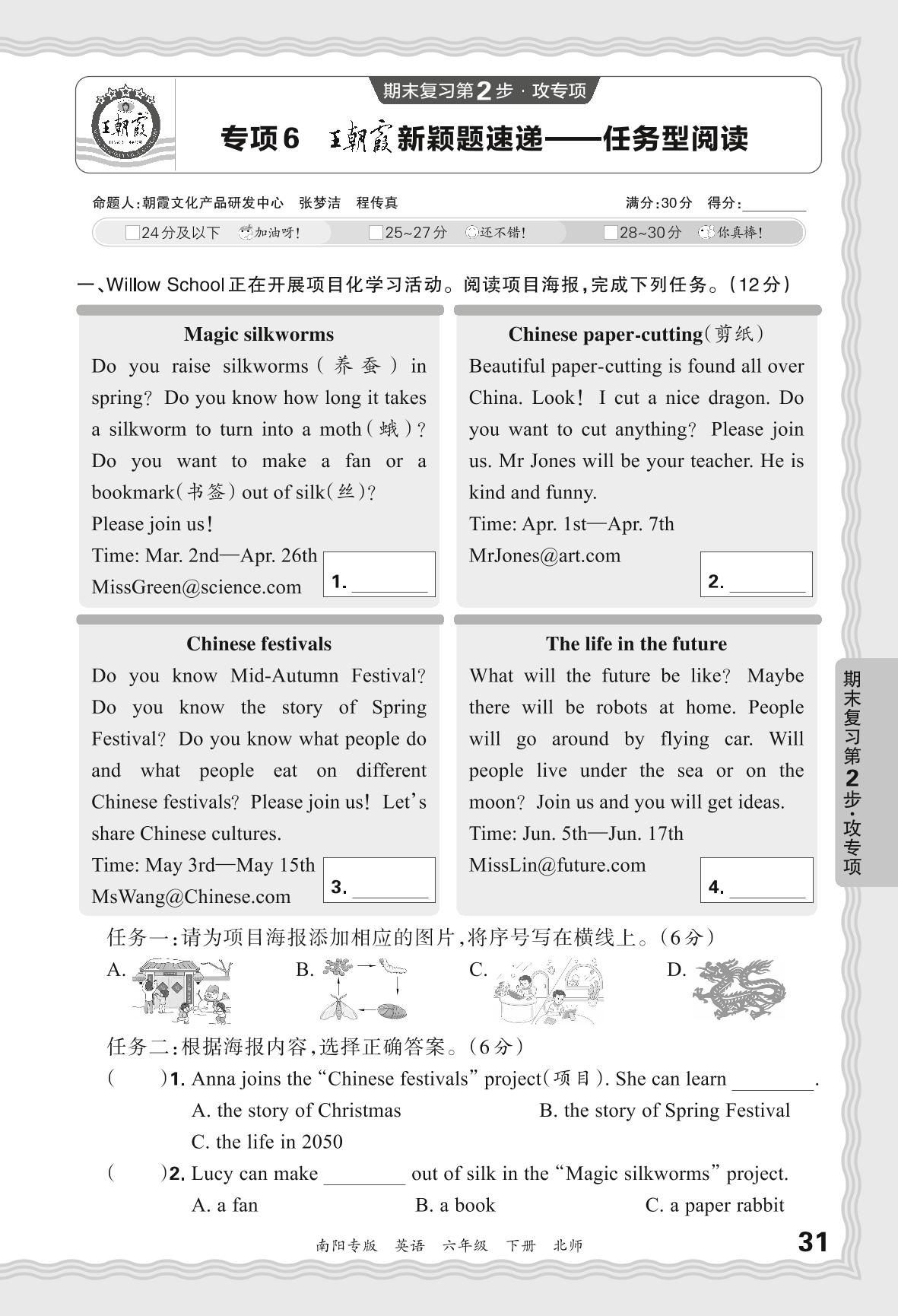 2024春下册六年级英语北师版 期末专项卷南阳版·王朝霞新颖题速递——任务型阅读【6】