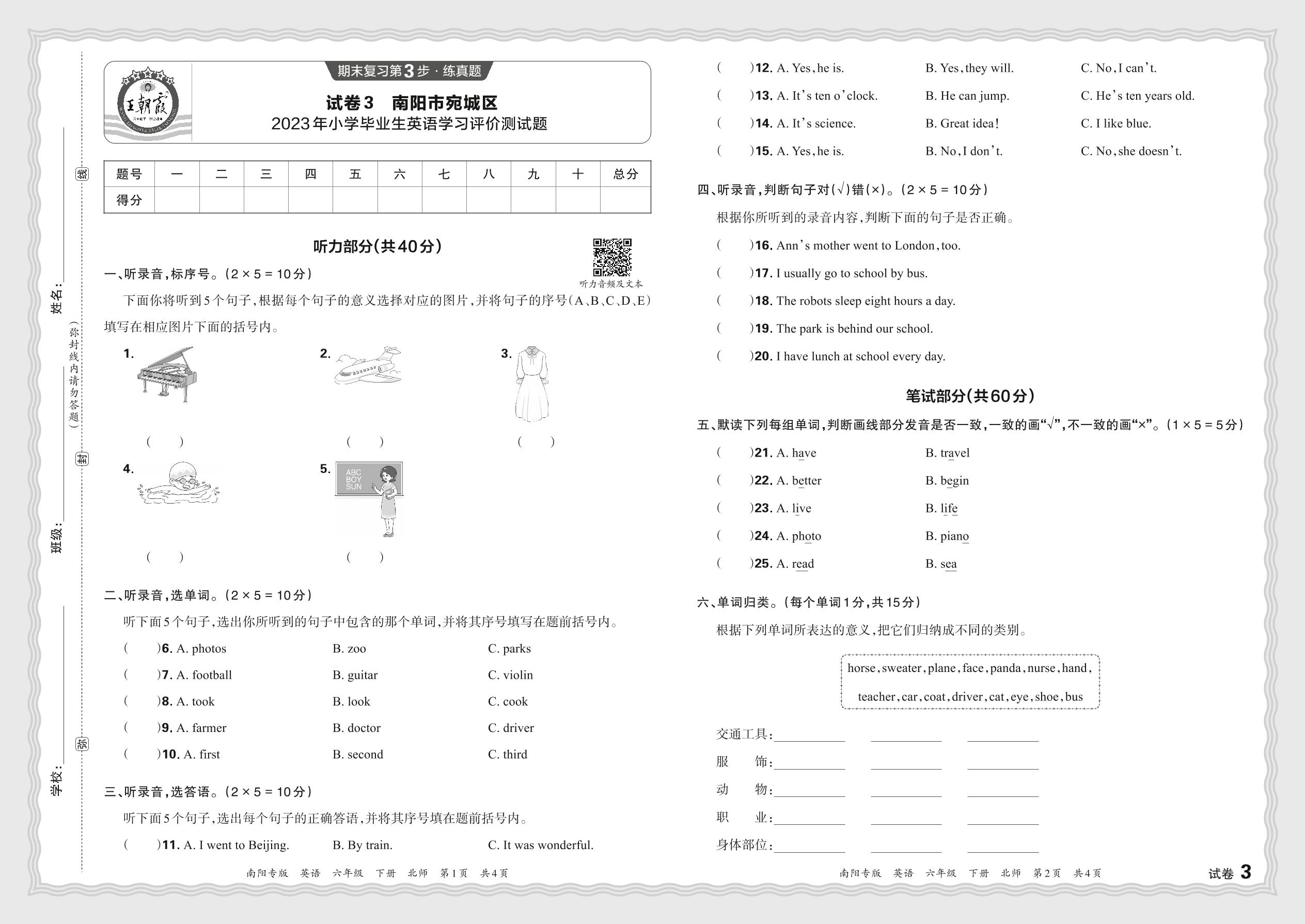河南省南阳市宛城区2023年小学毕业生英语学习评价测试题(北师版)【3】