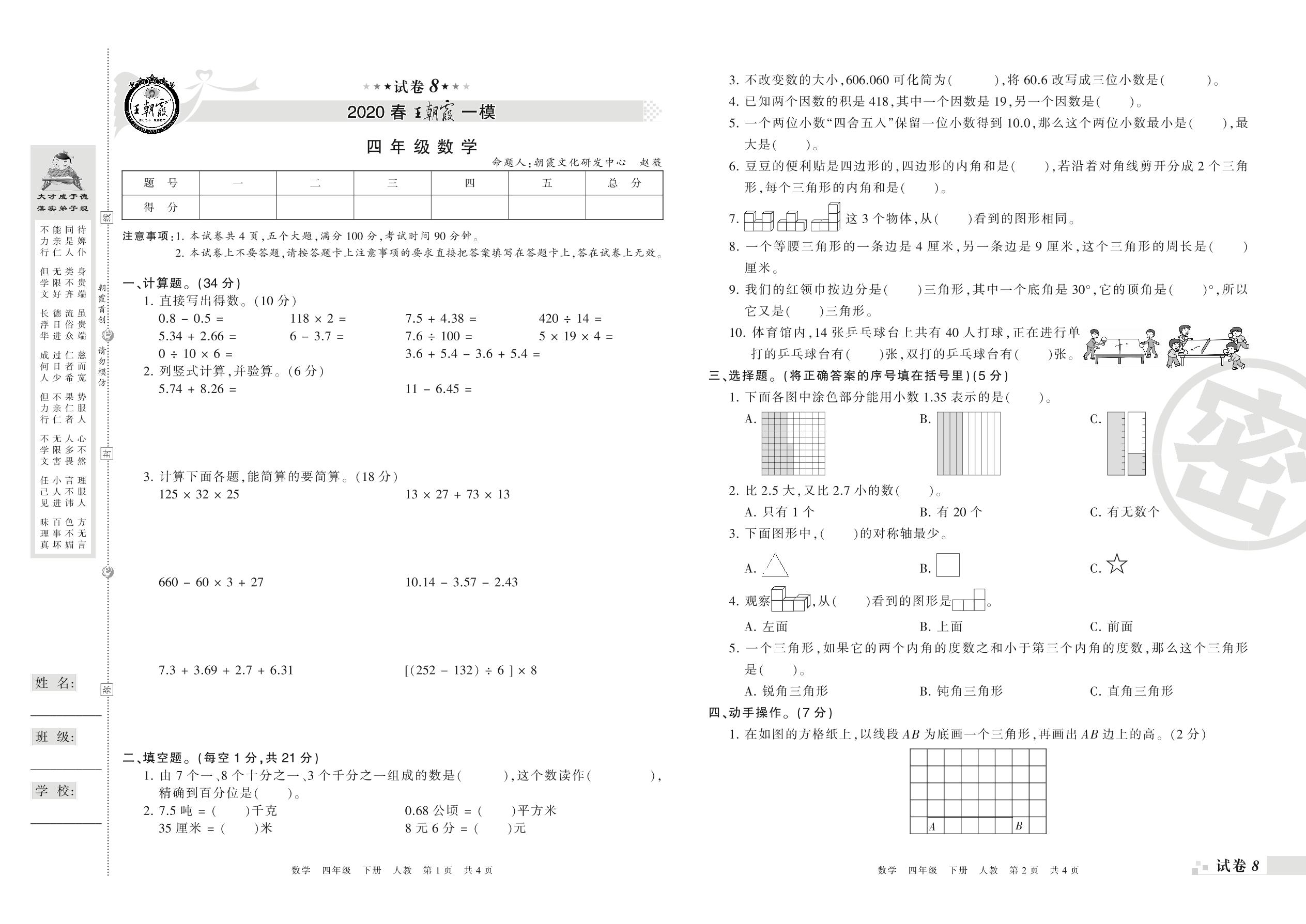 王朝霞期末模拟卷四年级下册数学(人教版)_R210804142618【8】