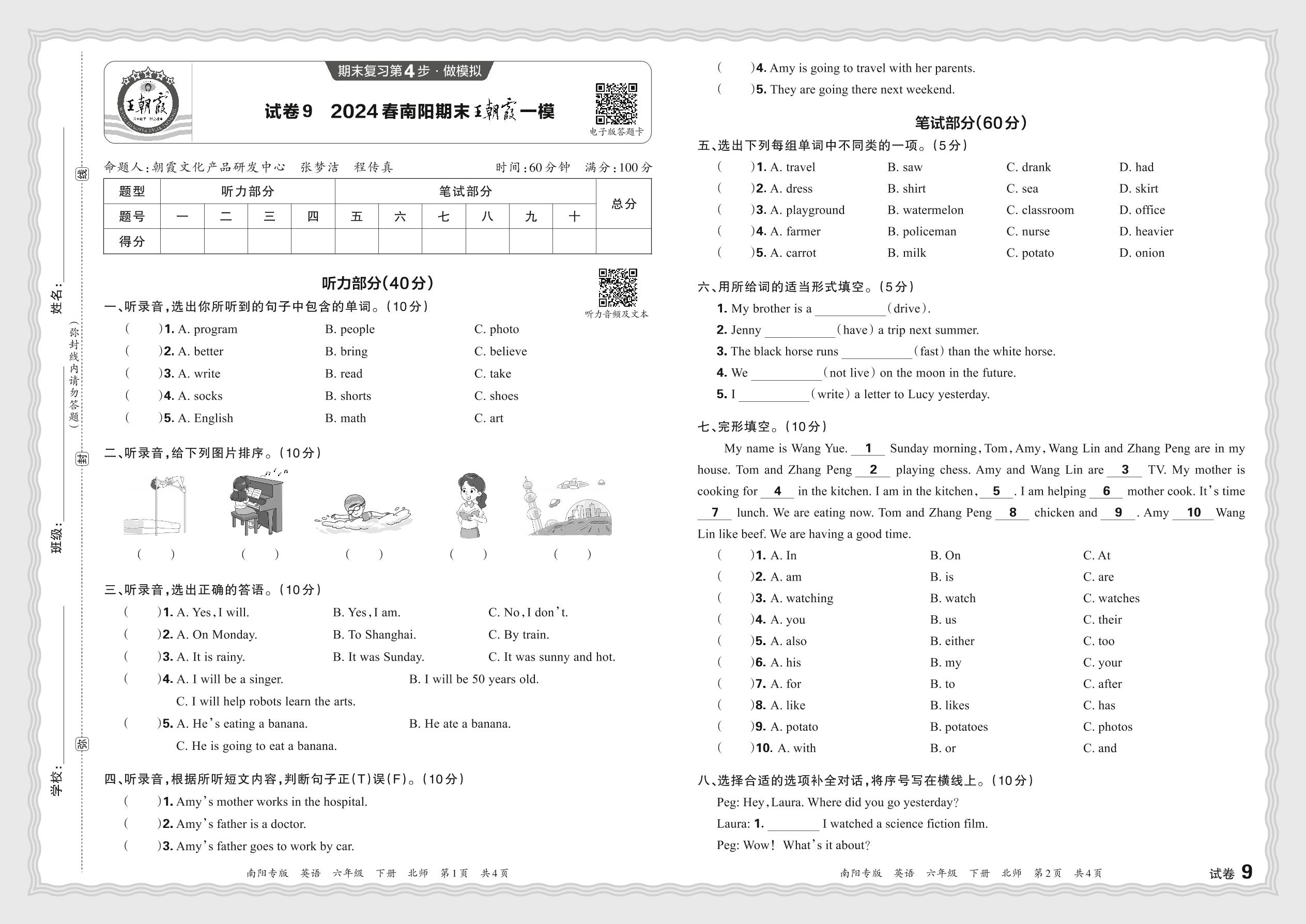 2024春下册六年级英语北师版 河南南阳期末王朝霞一模【9】