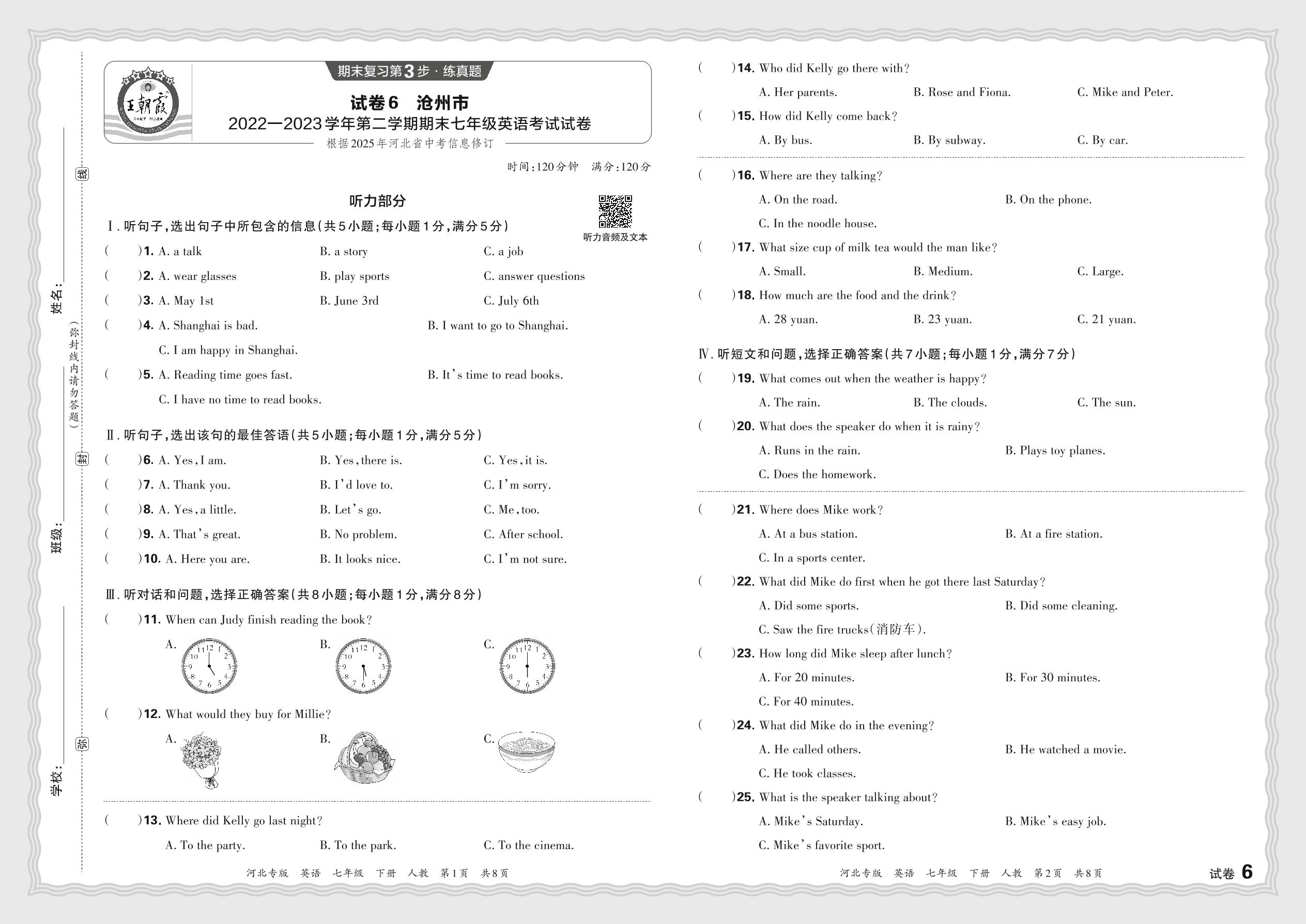 河北省沧州市2022-2023学年第二学期期末七年级英语考试试卷(人教版)【6】
