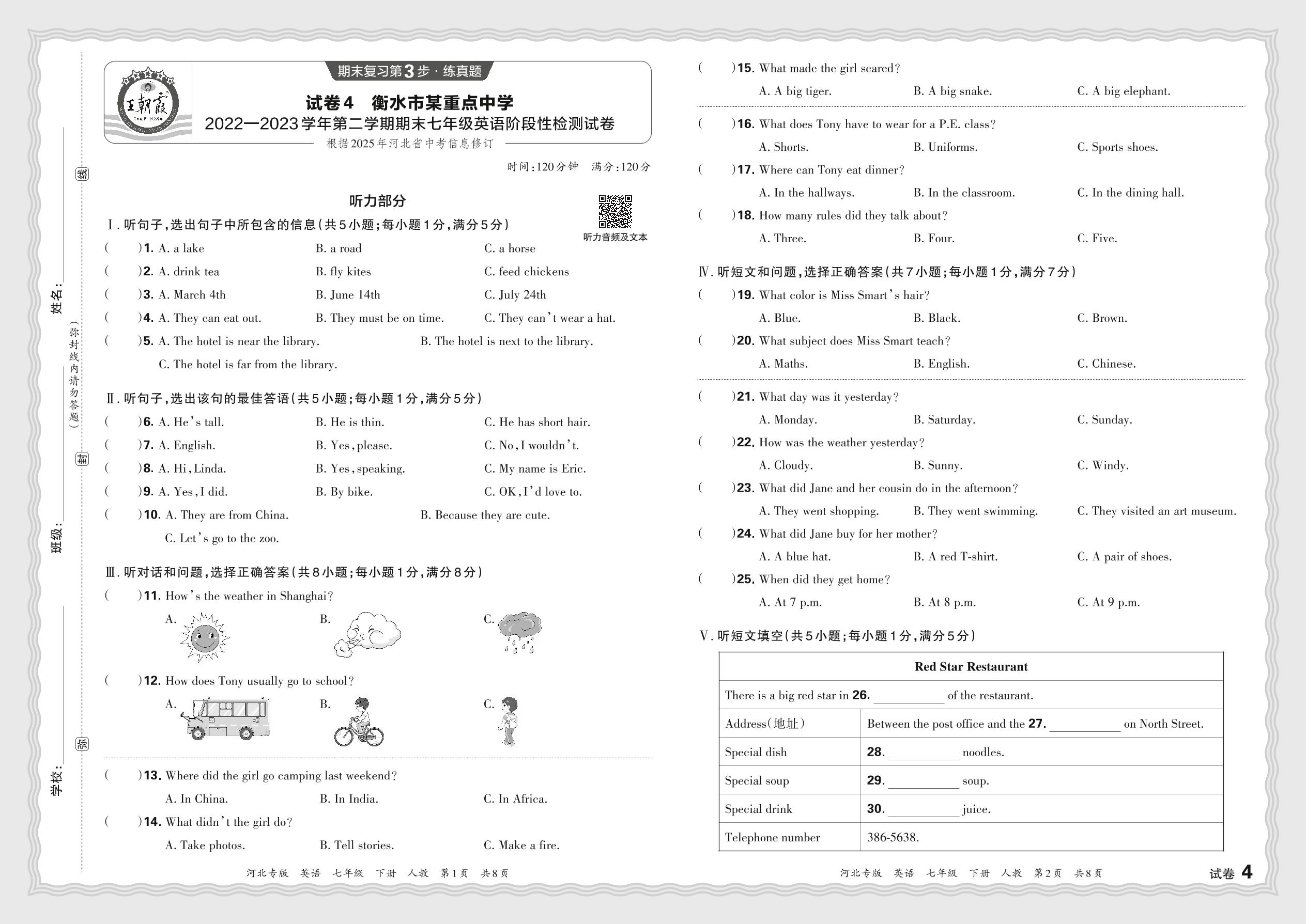 河北省衡水市某重点中学2022-2023学年第二学期期末七年级英语阶段性检测试卷(人教版)【4】