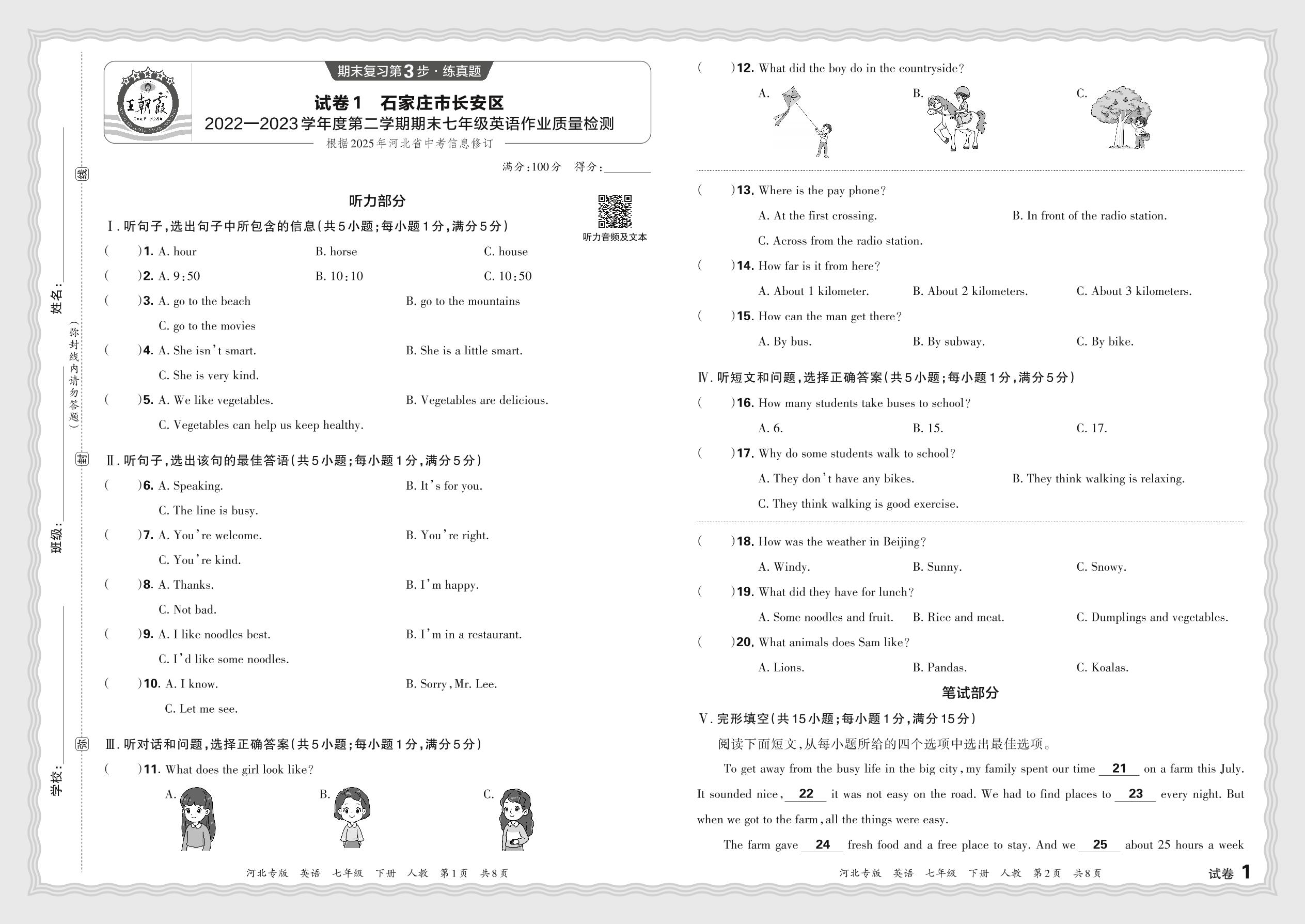 河北省石家庄市长安区2022-2023学年度第二学期期末七年级英语作业质量检测(人教版)【1】