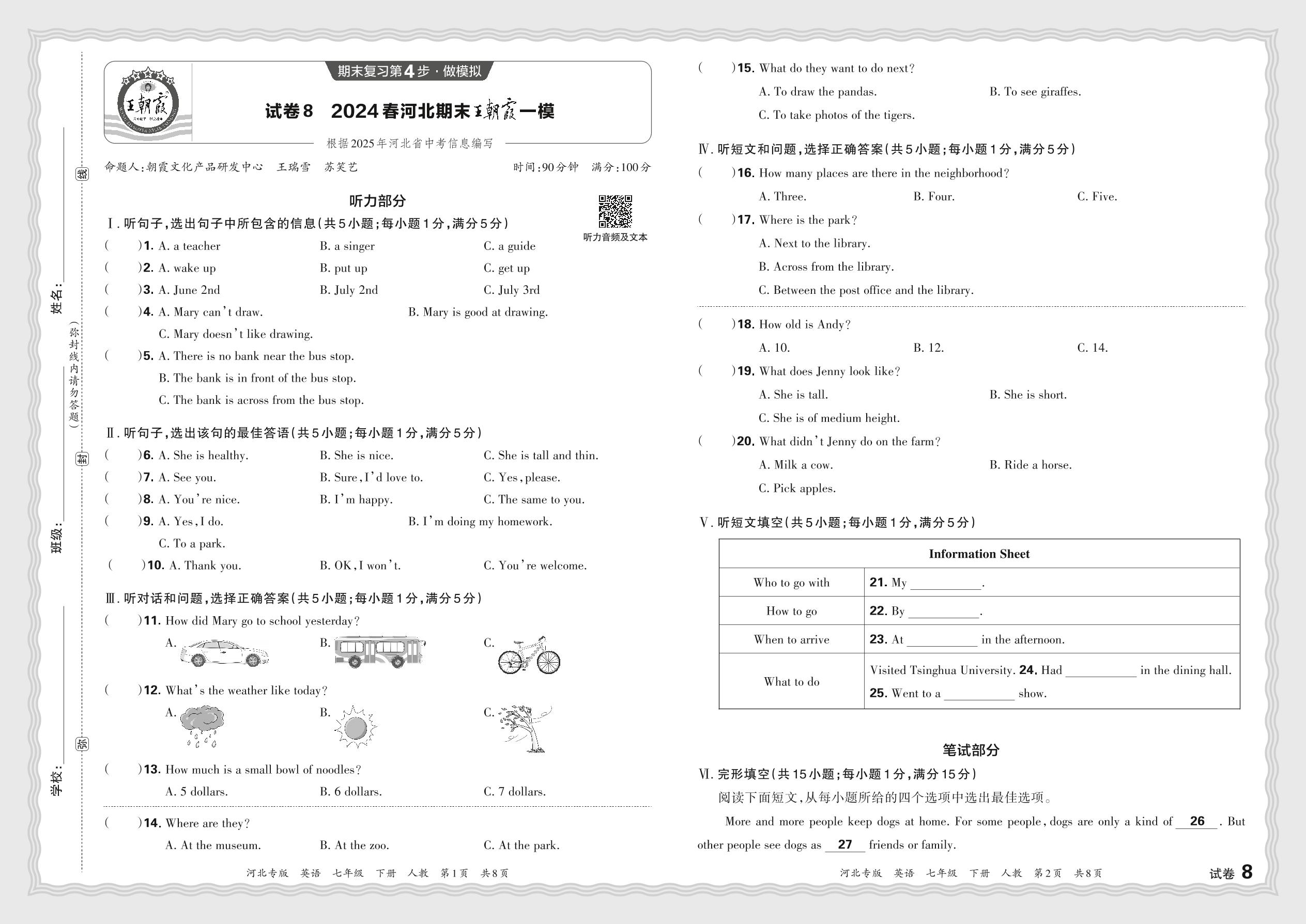 2024春下册七年级英语人教版 河北期末王朝霞一模【8】