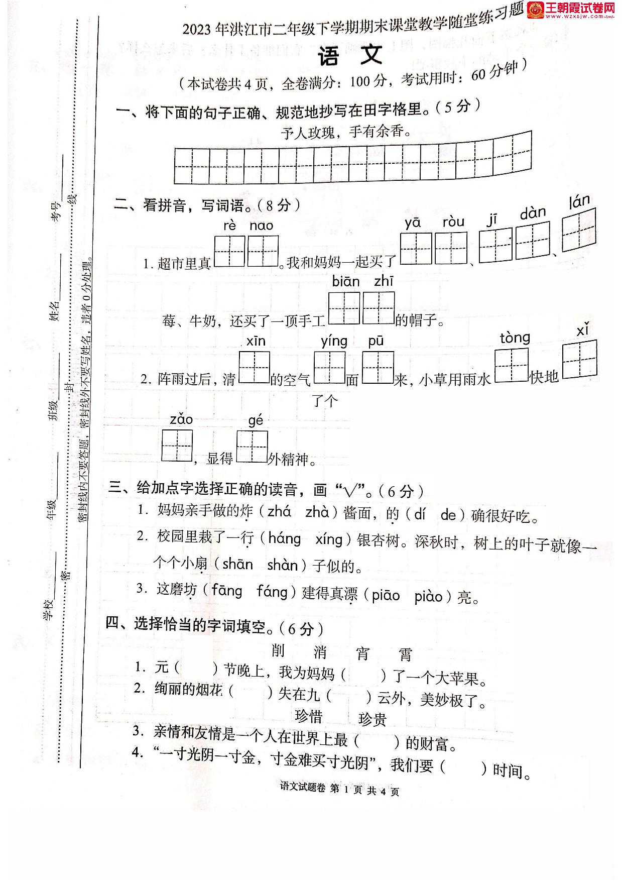 湖南省怀化市洪江市2022-2023学年下学期期末课堂教学随堂练习题二年级语文(人教版)