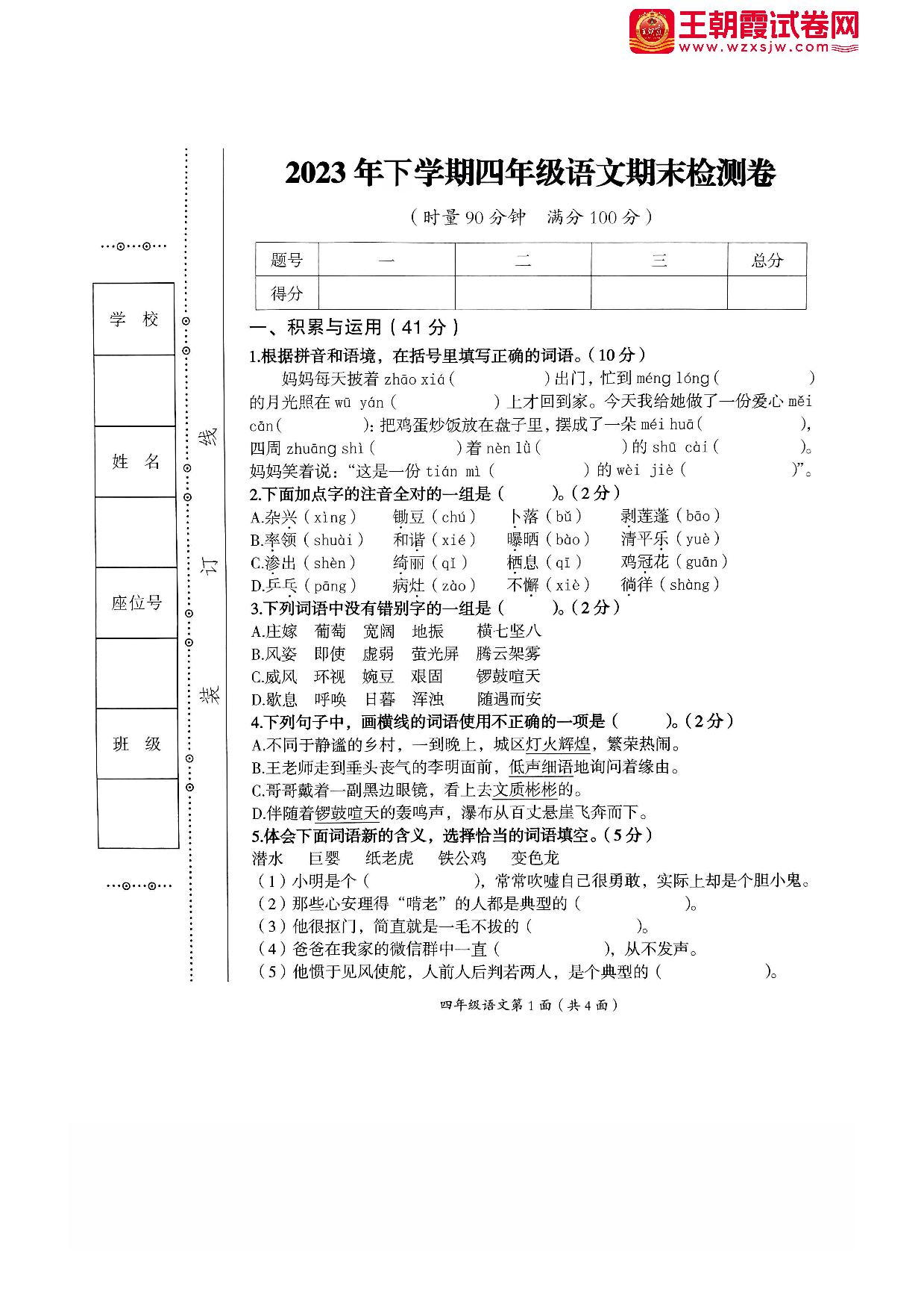 四年级语文人教版下册期末卷