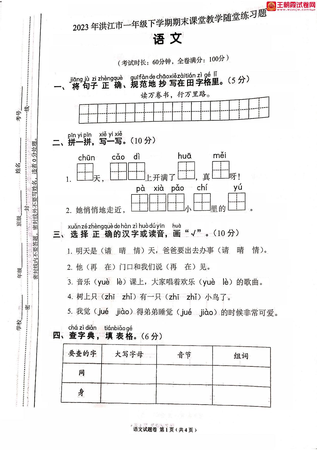 湖南省怀化市洪江市2022-2023学年下学期期末课堂教学随堂练习题一年级语文(人教版)