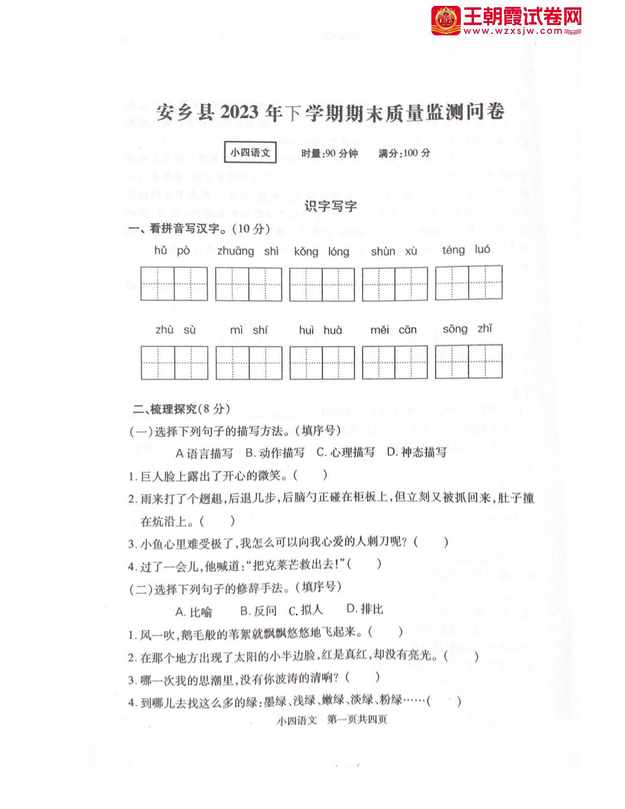 湖南省常德市安乡县2022-2023学年下学期期末质量监测问卷四年级语文(人教版)