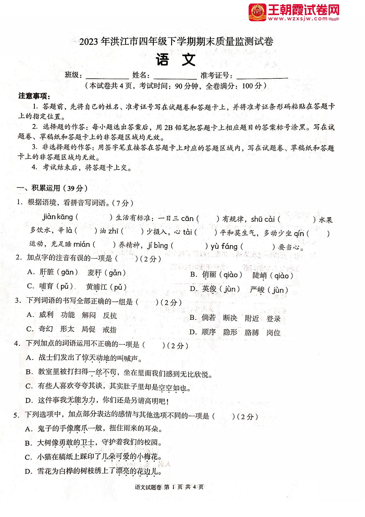 湖南省洪江市2022-2023学年下学期期末质量监测试卷四年级语文(人教版)