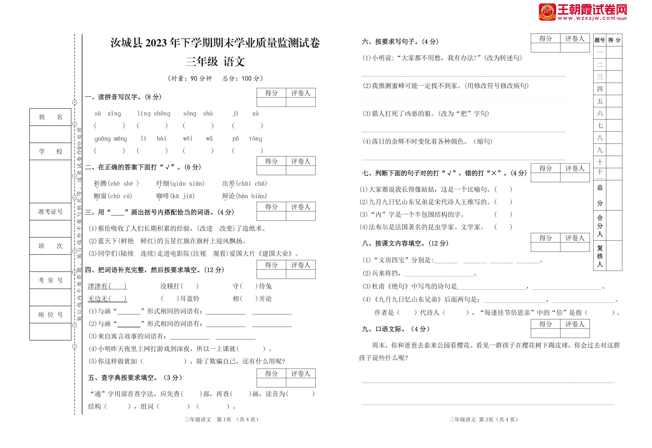 湖南省郴州市汝城县2022-2023学年下学期期末学业质量监测试卷三年级语文(人教版)