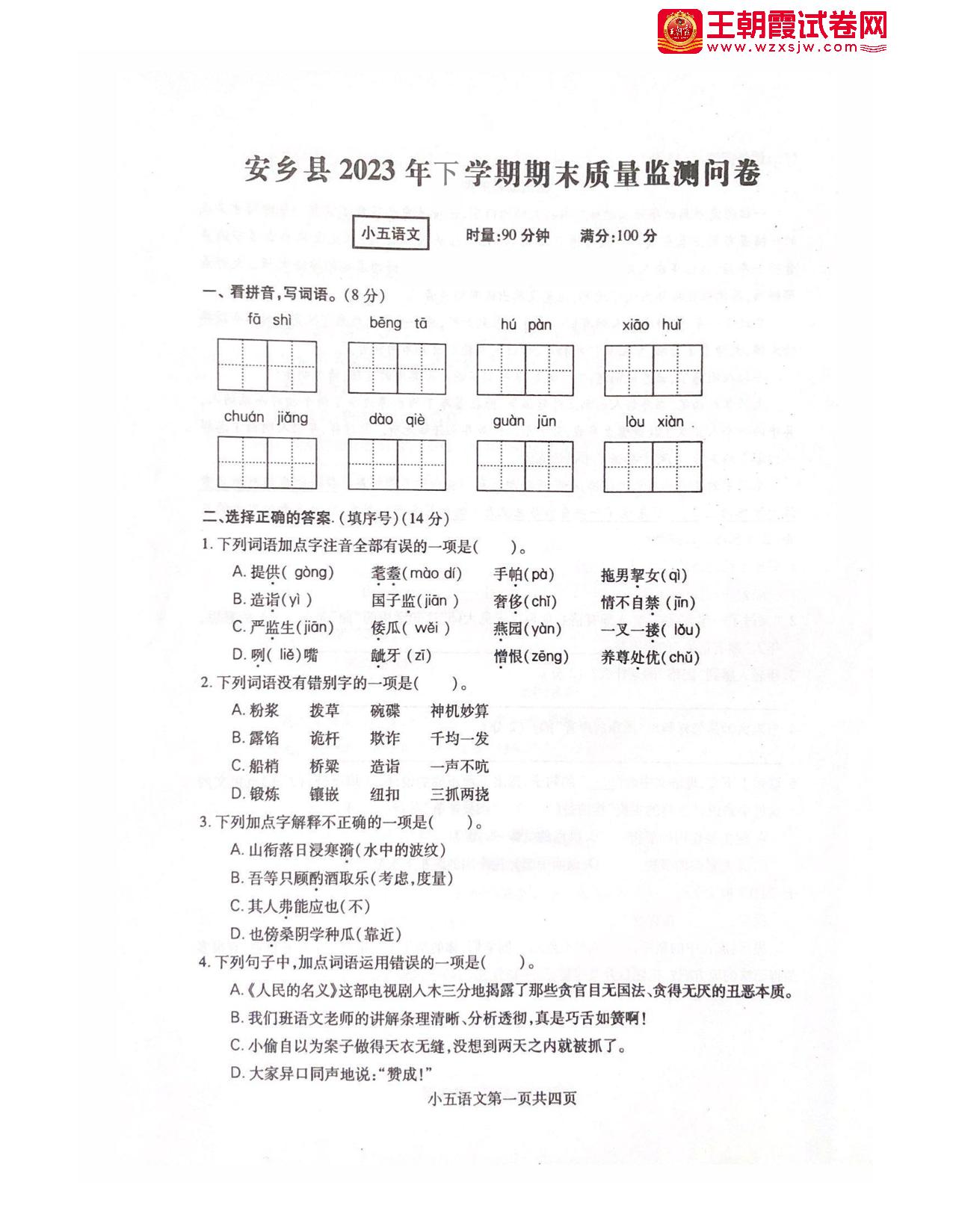 湖南省常德市安乡县2022-2023学年下学期期末质量监测问卷五年级语文(人教版)