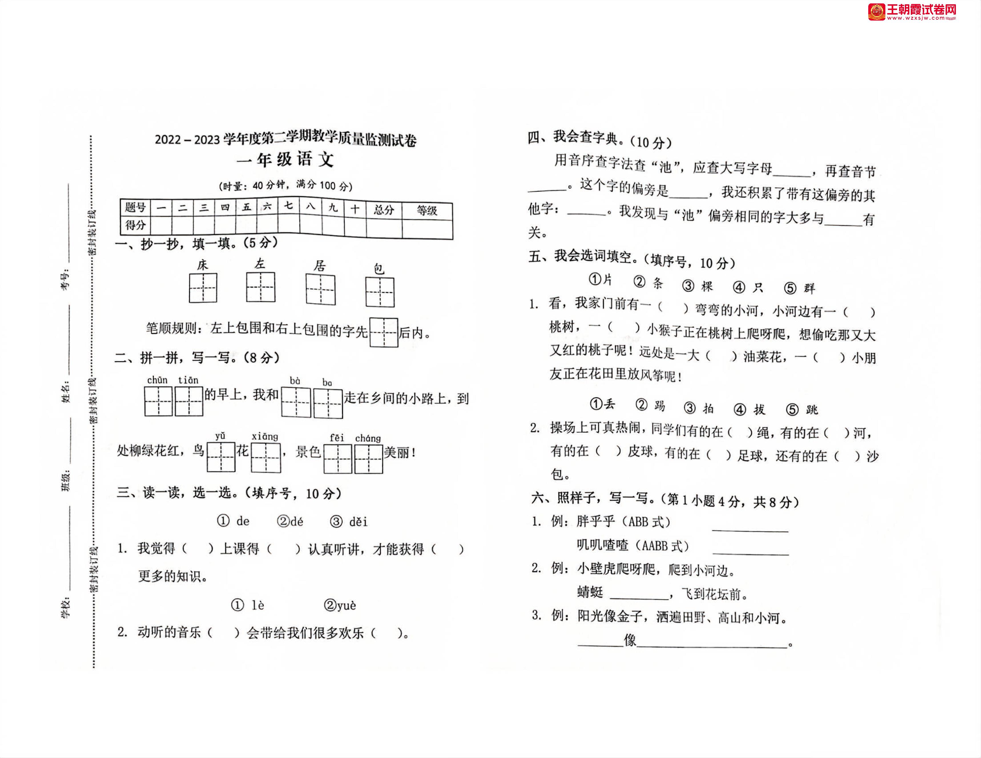 湖南省岳阳市华容县2022-2023学年度第二学期教学质量监测试卷一年级语文(人教版)