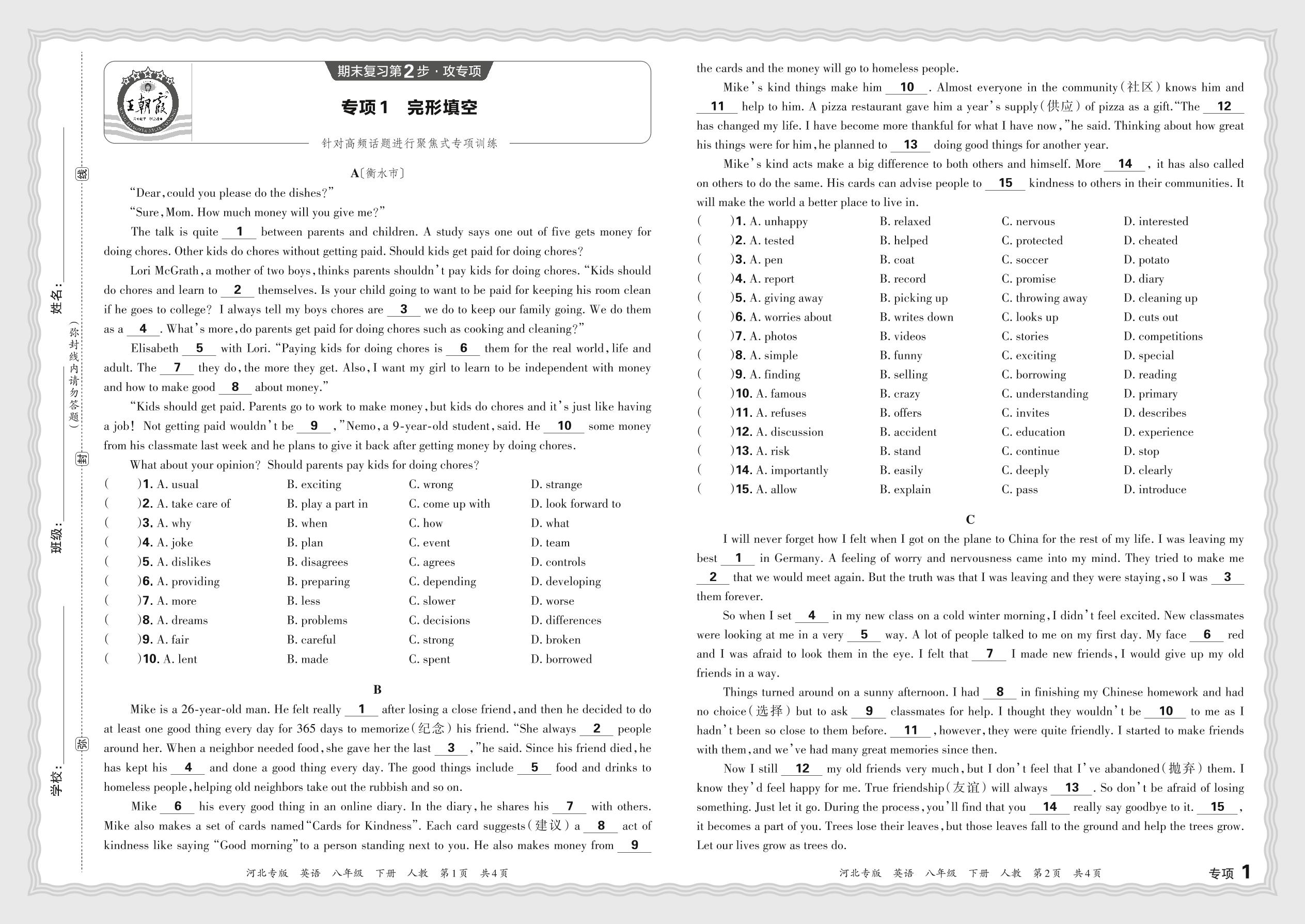 2024春下册八年级英语人教版 期末专项卷河北版·完形填空【1】