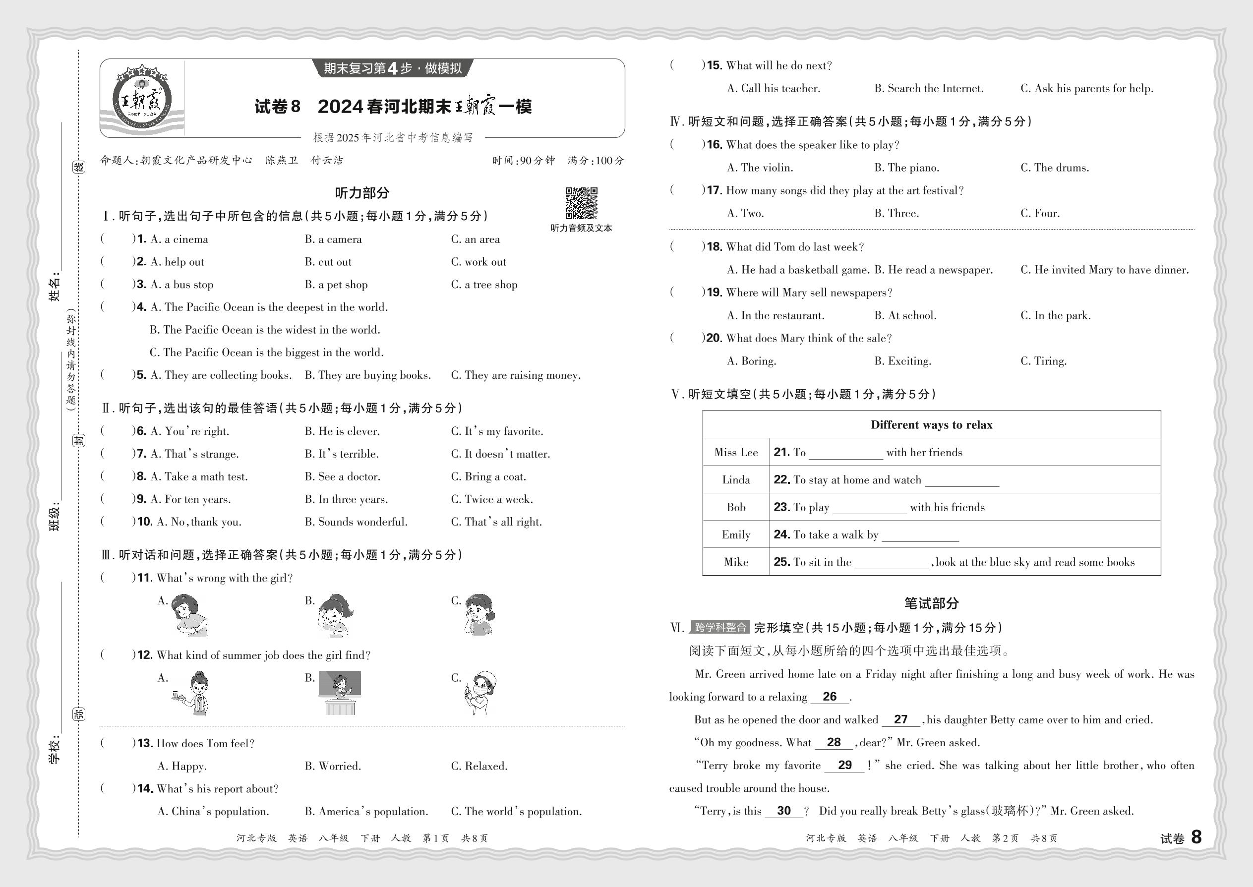 2024春下册八年级英语人教版 河北期末王朝霞一模【8】