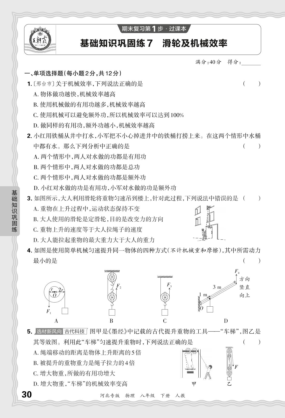 2024春下册八年级物理人教版 期末过课本河北版·基础知识巩固练 滑轮及机械效率【7】