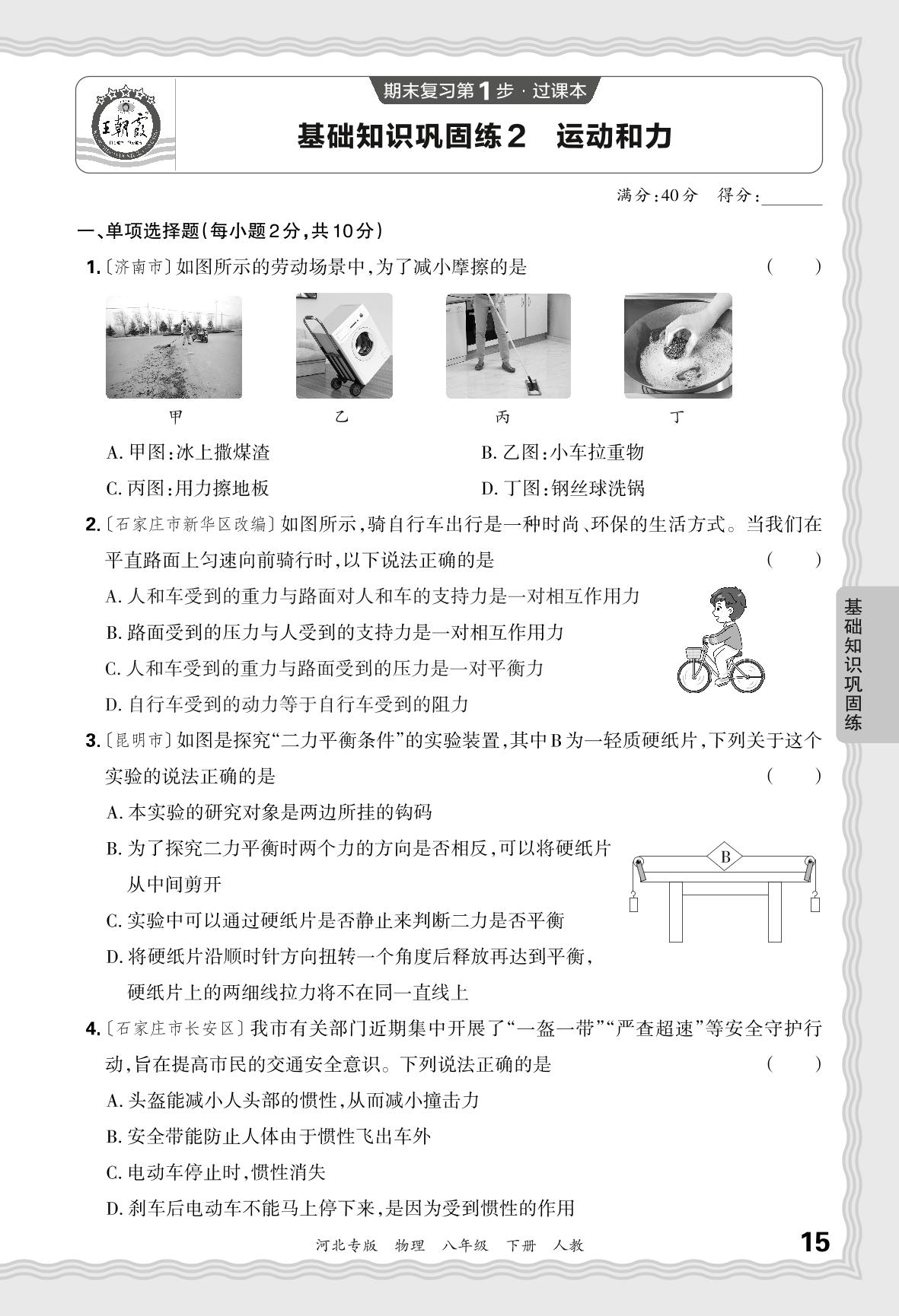 2024春下册八年级物理人教版 期末过课本河北版·基础知识巩固练 运动和力【2】