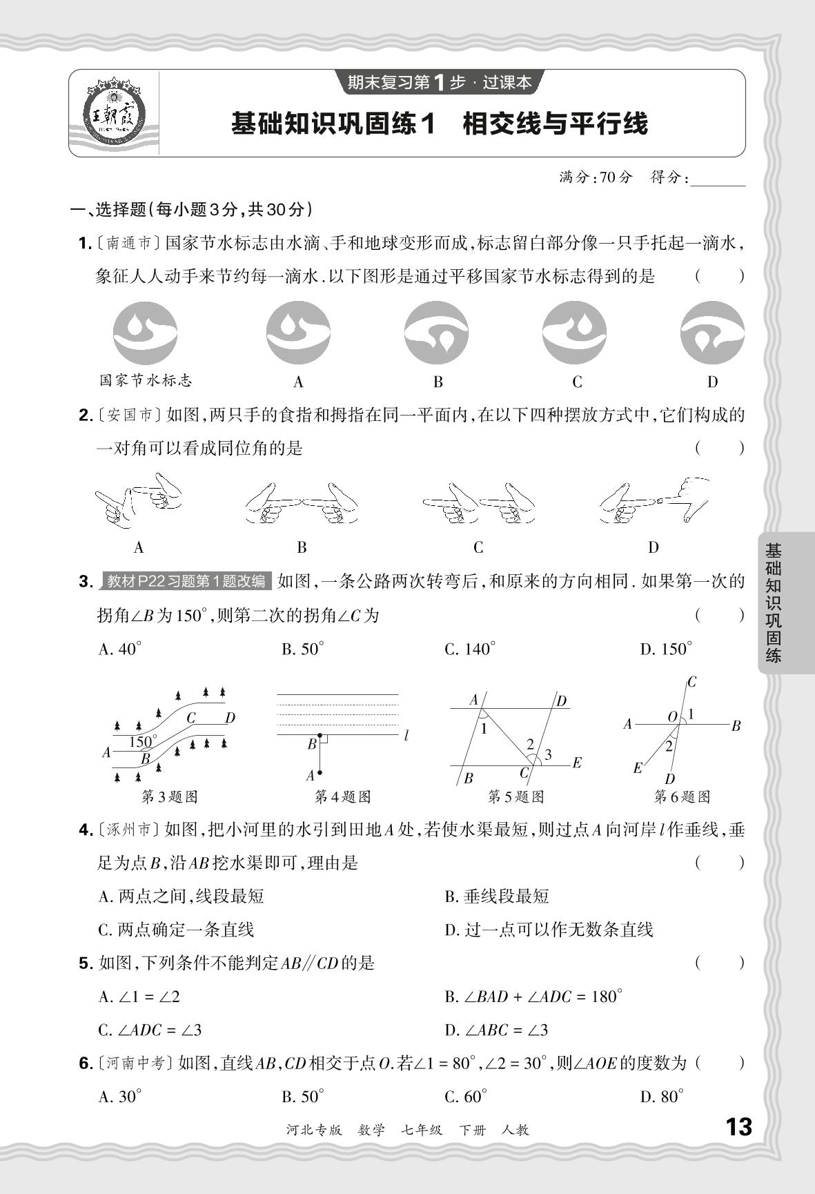 2024春下册七年级数学人教版 期末过课本河北版·基础知识巩固练 相交线与平行线【1】