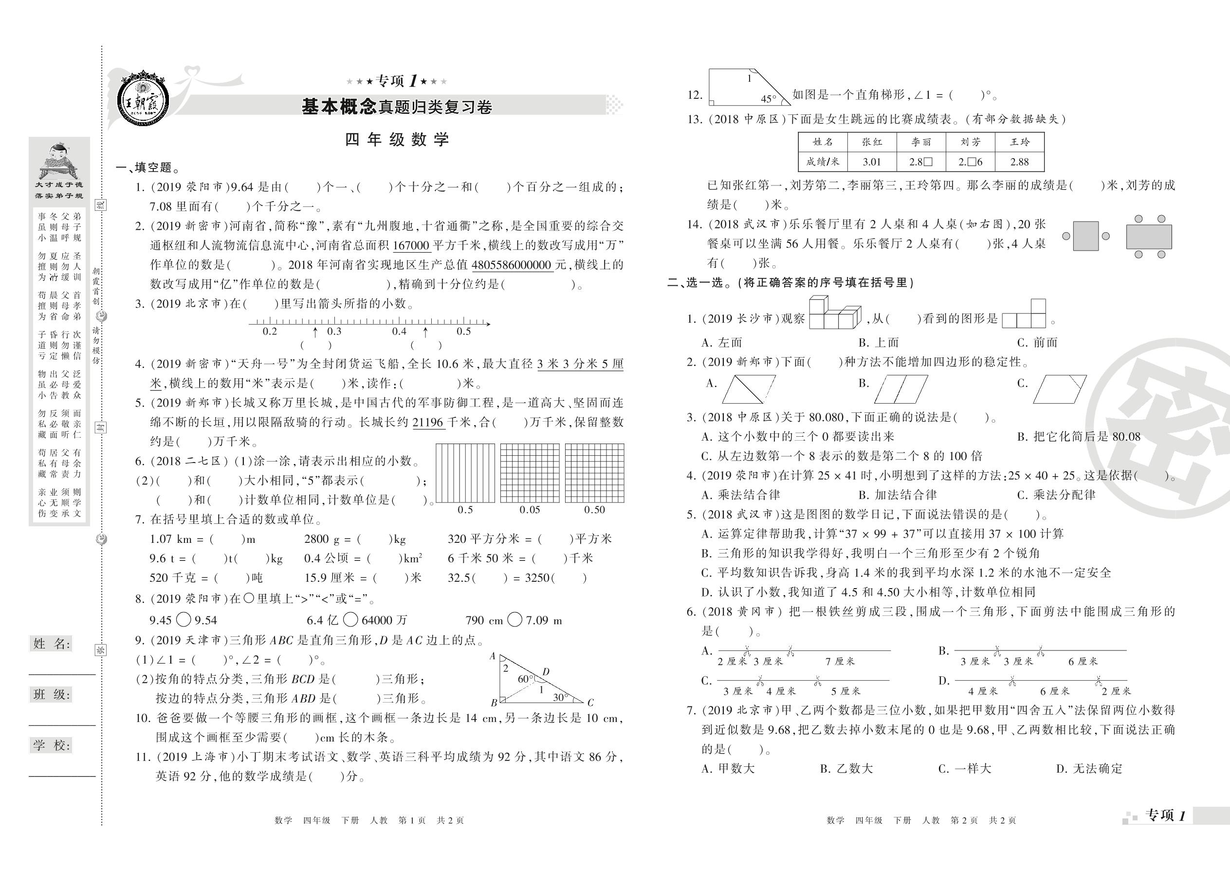 王朝霞期末专项卷——基本概念、计算真题归类复习卷四年级下册数学(人教版)_R210804142726【0】