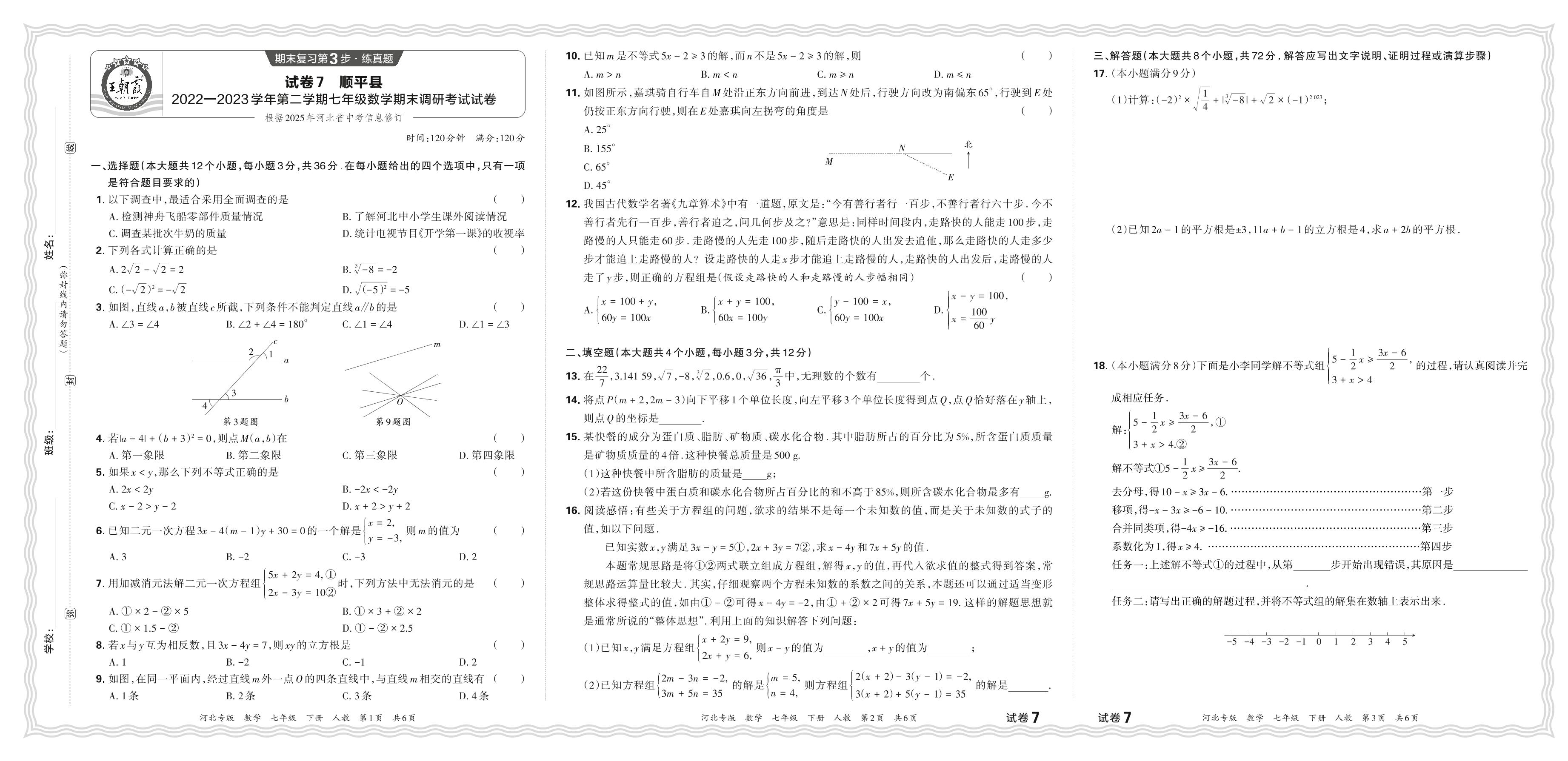 河北省保定市顺平县2022-2023学年第二学期七年级数学期末调研考试试卷(人教版)【7】