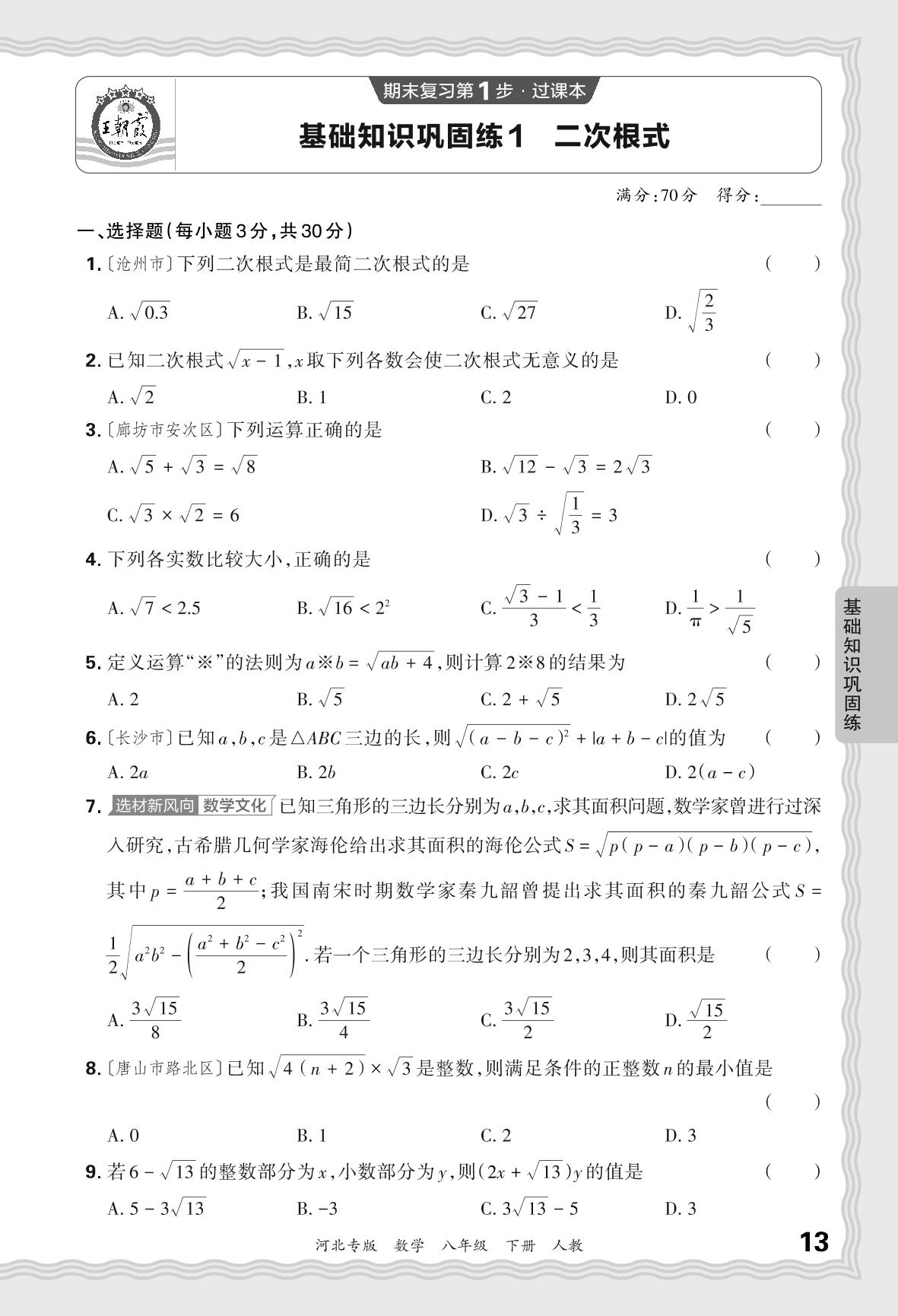 2024春下册八年级数学人教版 期末过课本河北版·基础知识巩固练 二次根式【1】