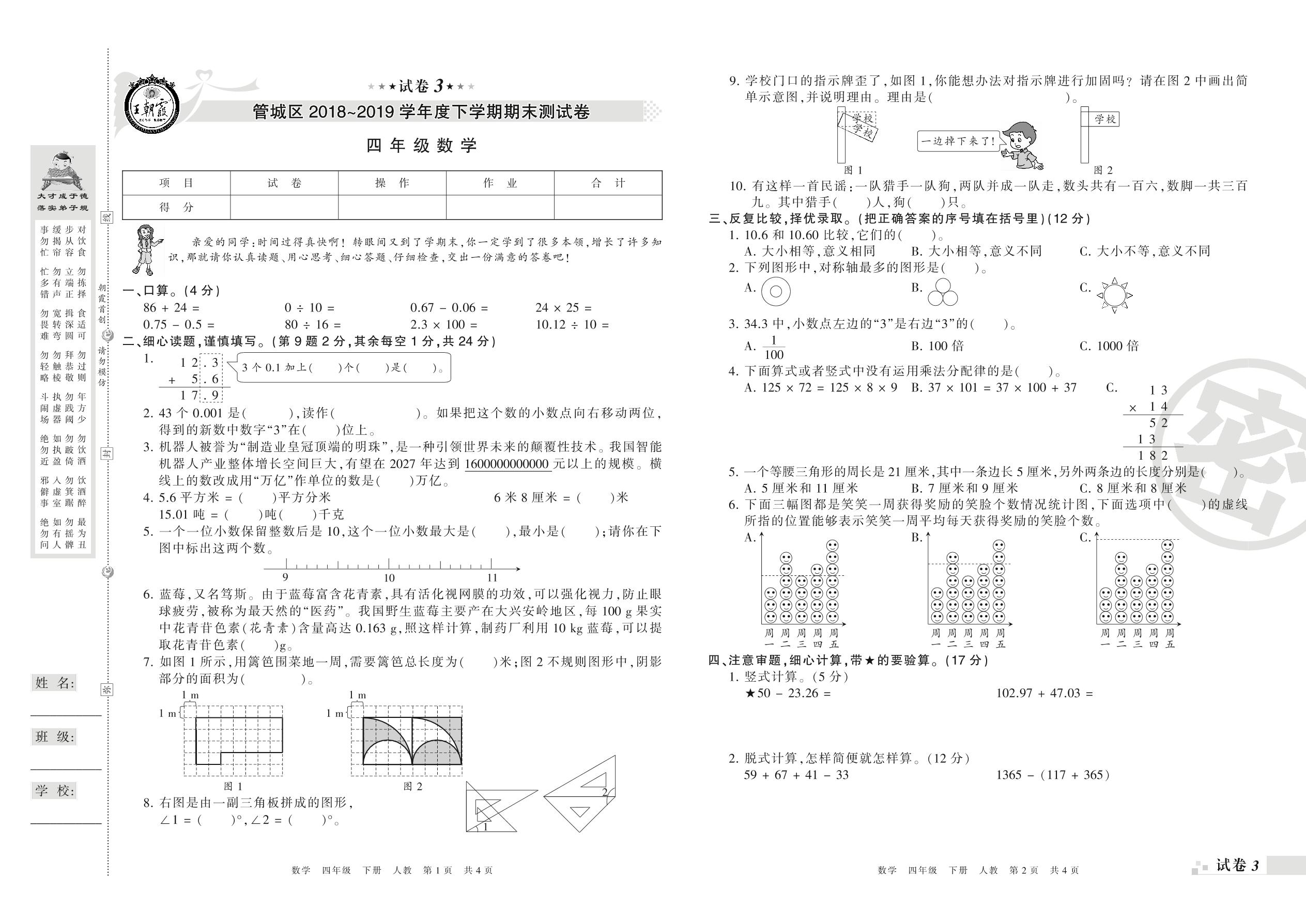 2018-2019学年第二学期郑州市管城区四年级数学试卷(人教版)【3】