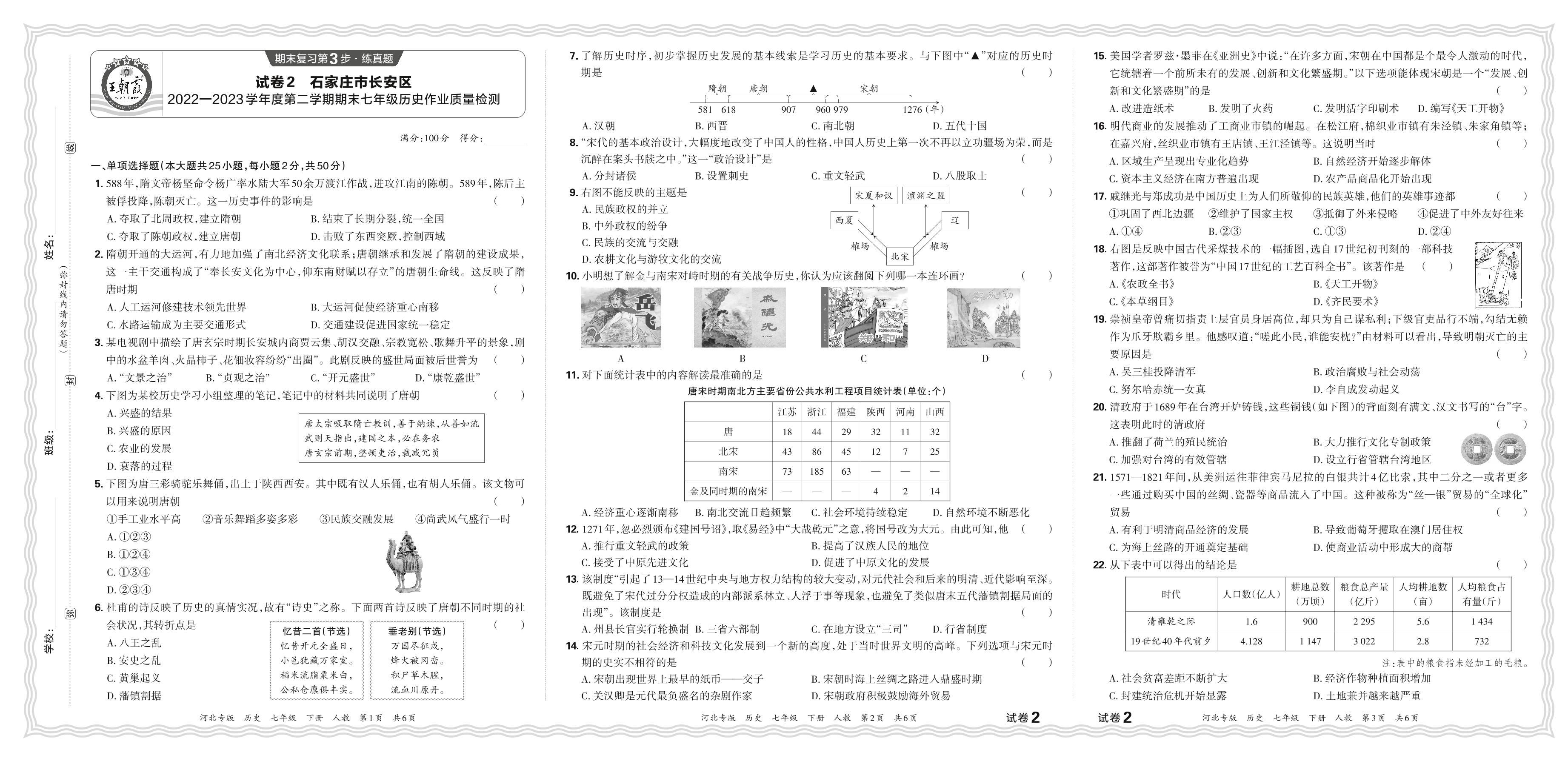 河北省石家庄市长安区2022-2023学年度第二学期七年级历史作业质量检测(人教版)【2】