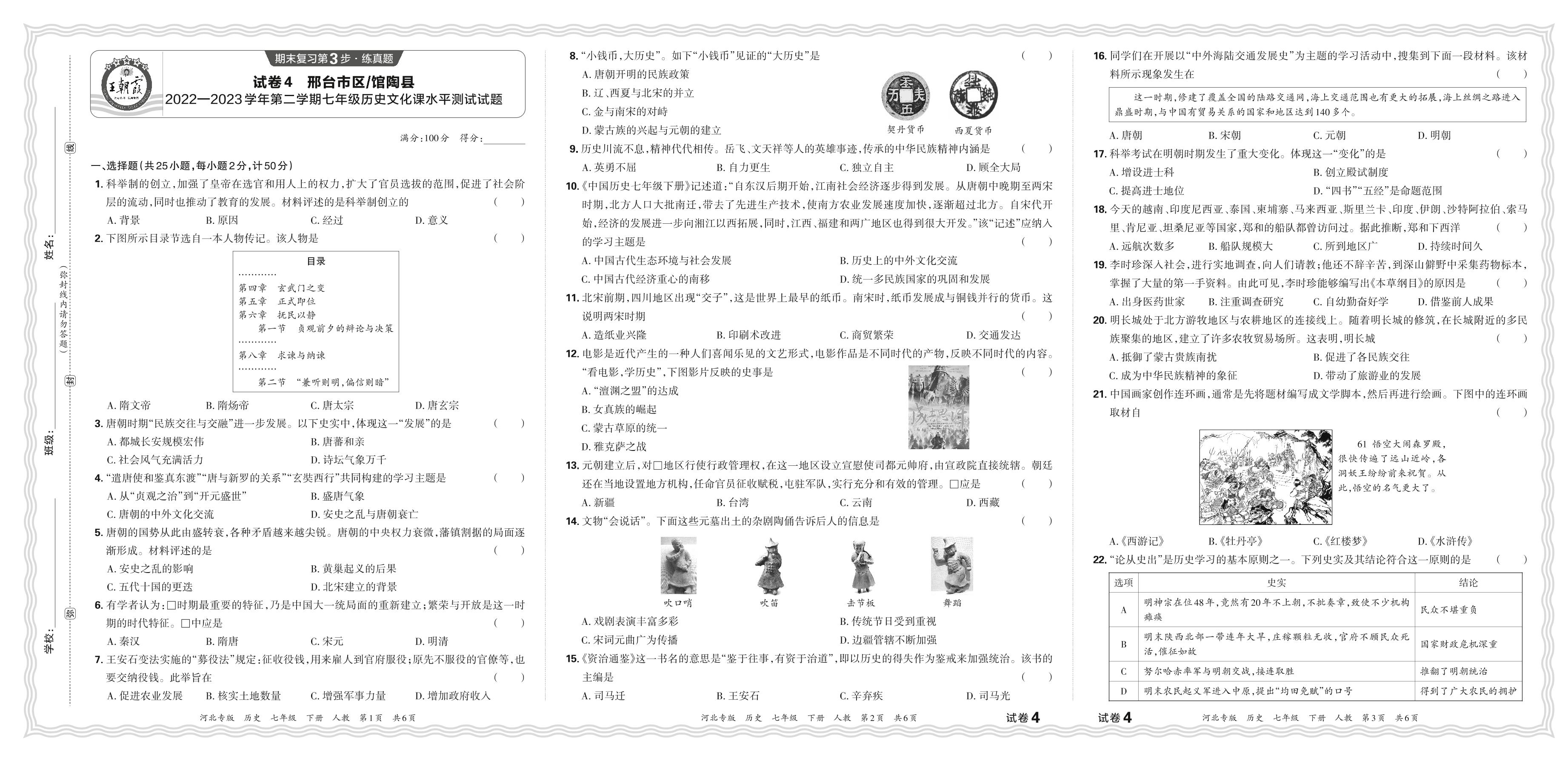河北省邢台市区、邯郸市馆陶县2022-2023学年第二学期七年级历史文化课水平测试试题(人教版)【4】