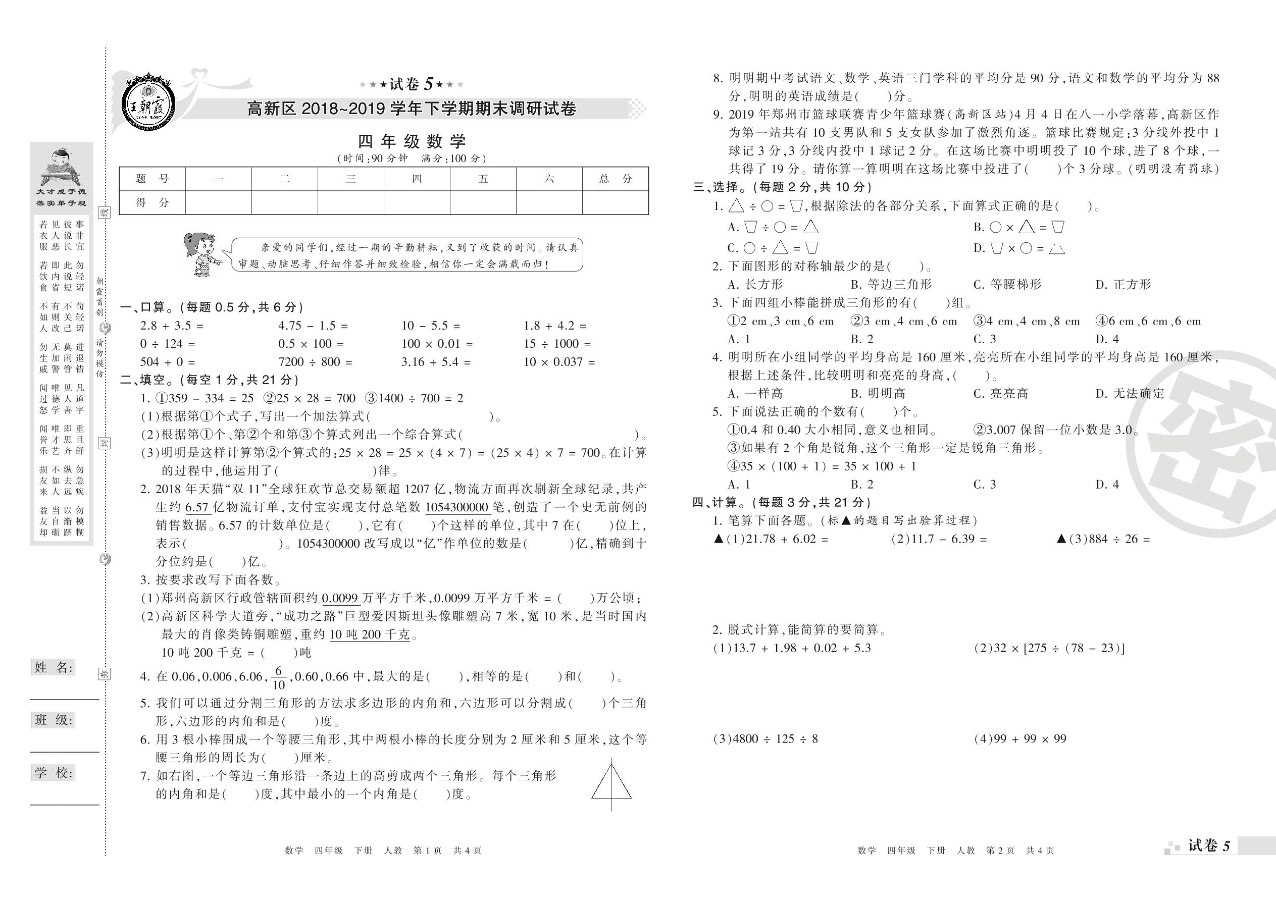 2018-2019学年第二学期郑州市高新区四年级数学试卷(人教版)【5】