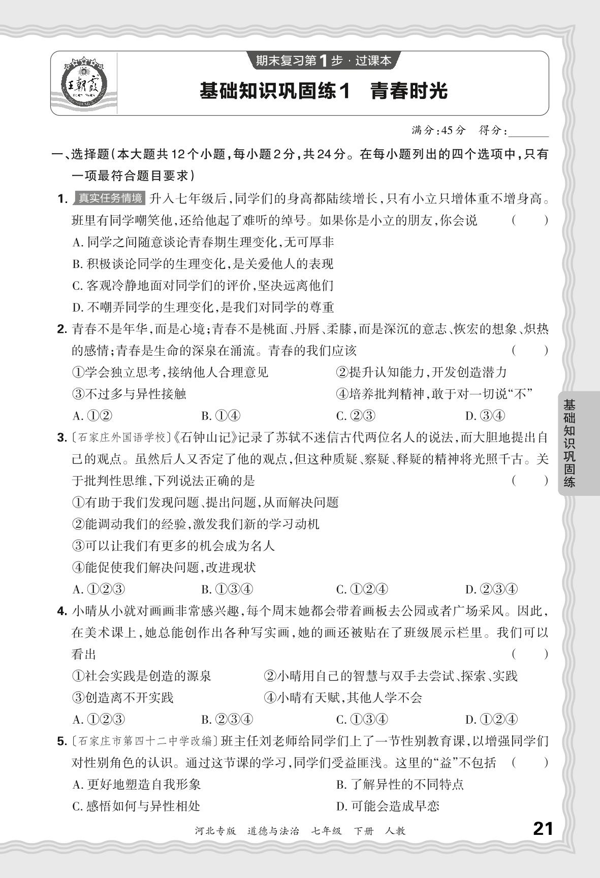2024春下册七年级道德与法治人教版 期末过课本河北版·基础知识巩固练 青春时光【1】