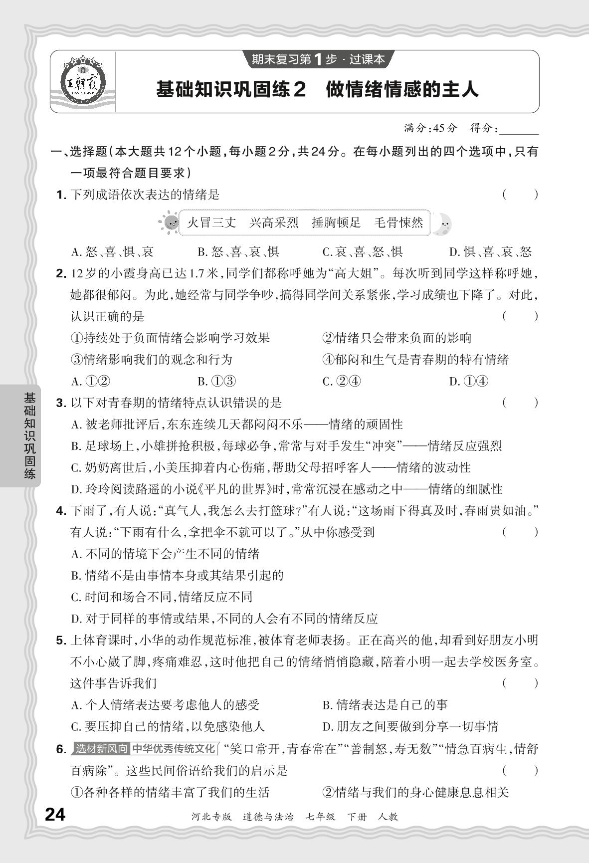 2024春下册七年级道德与法治人教版 期末过课本河北版·基础知识巩固练 做情绪情感的主人【2】