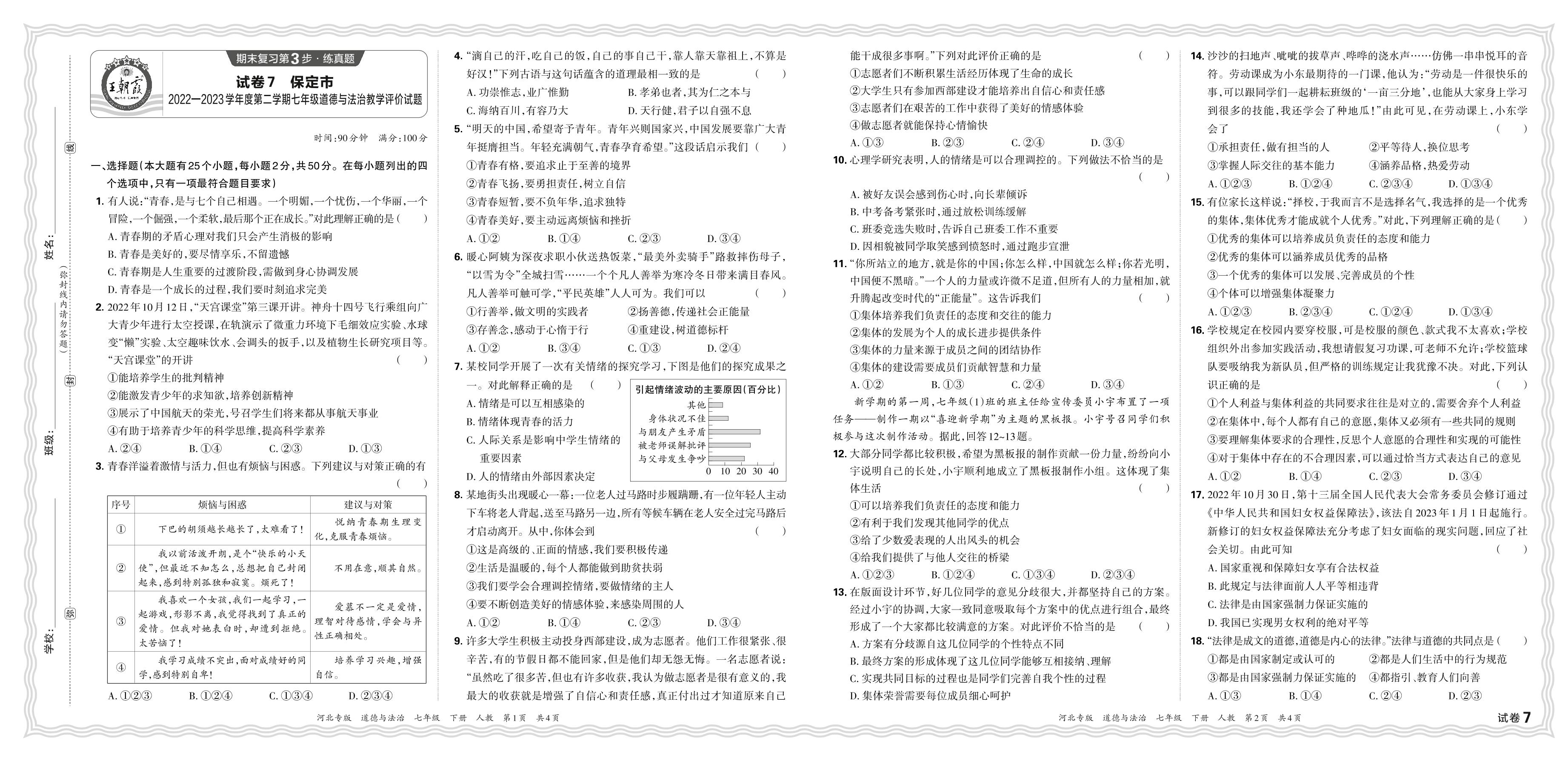 河北省保定市2022-2023学年度第二学期七年级道德与法治教学评价试题(人教版)【7】
