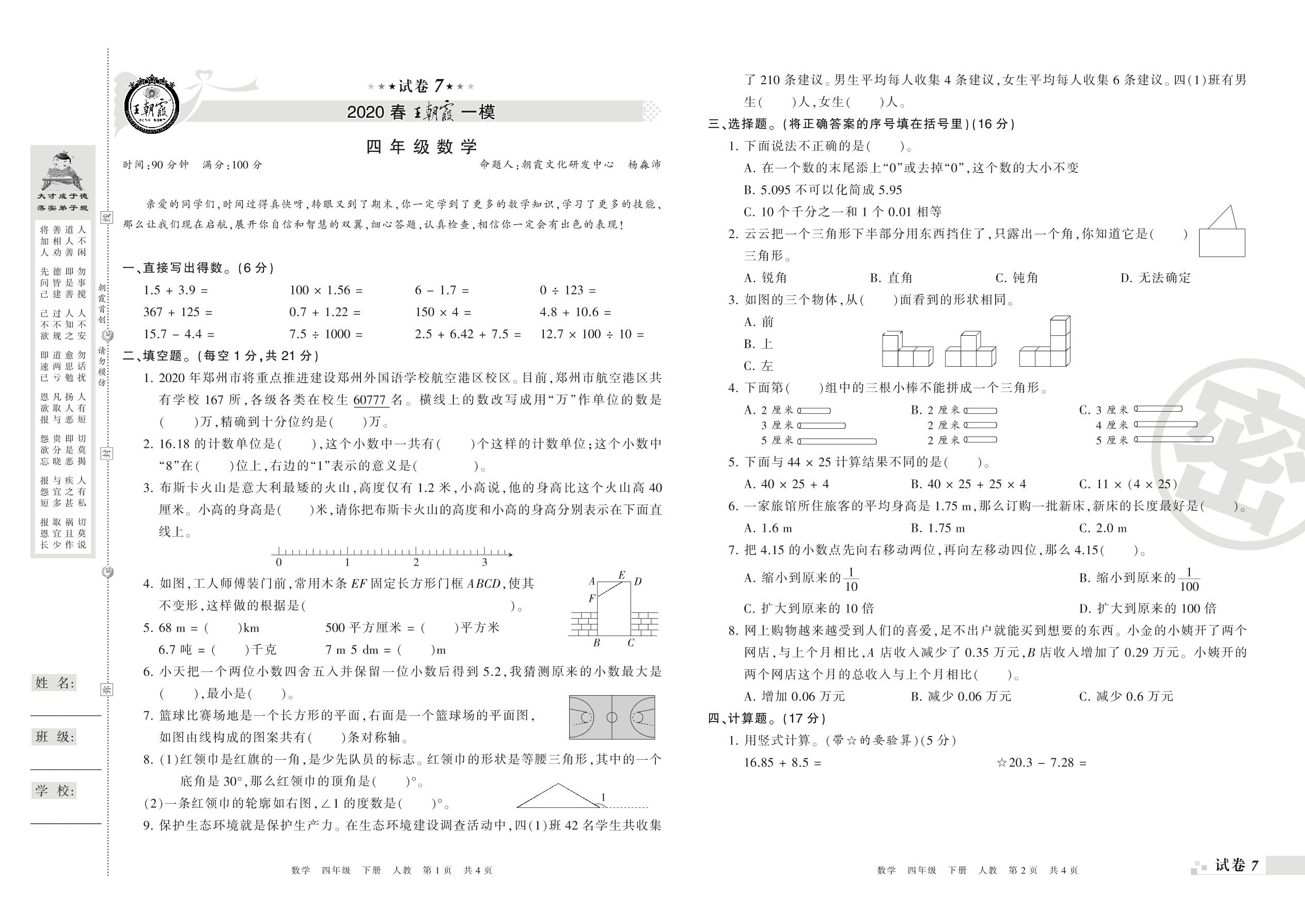 王朝霞期末模拟卷四年级下册数学(人教版)_R210804142809【7】