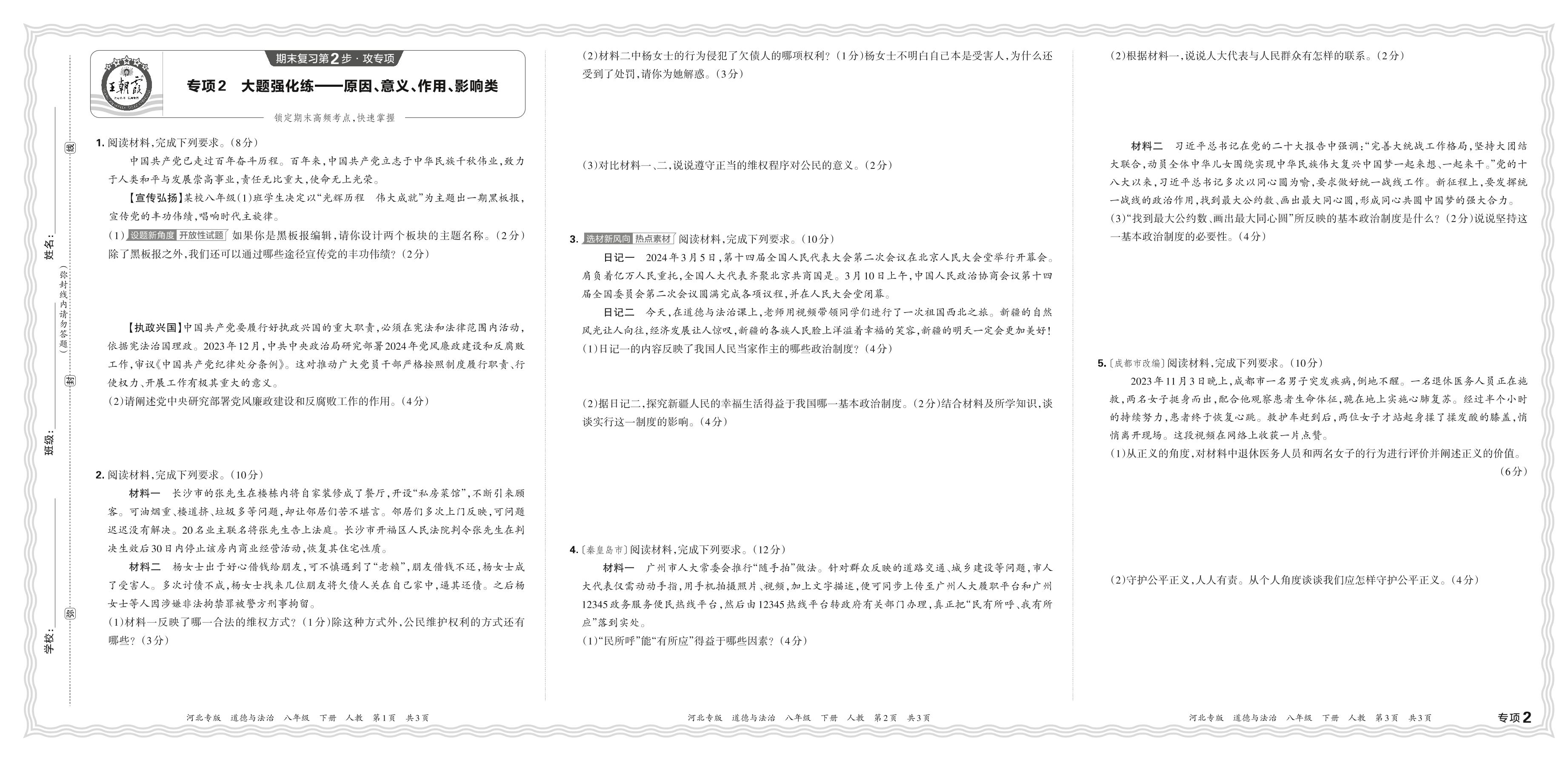 2024春下册八年级道德与法治人教版 期末专项卷河北版·大题强化练——原因、意义、作用、影响类【2】