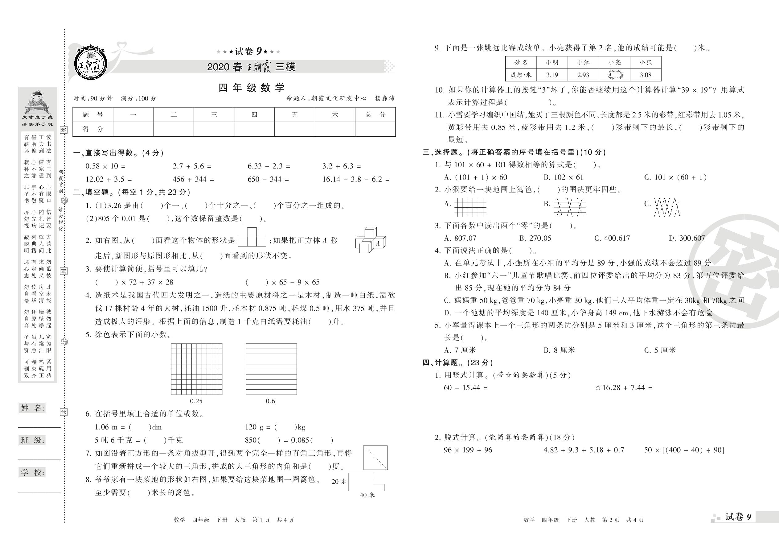 王朝霞期末模拟卷四年级下册数学(人教版)_R210804142817【9】