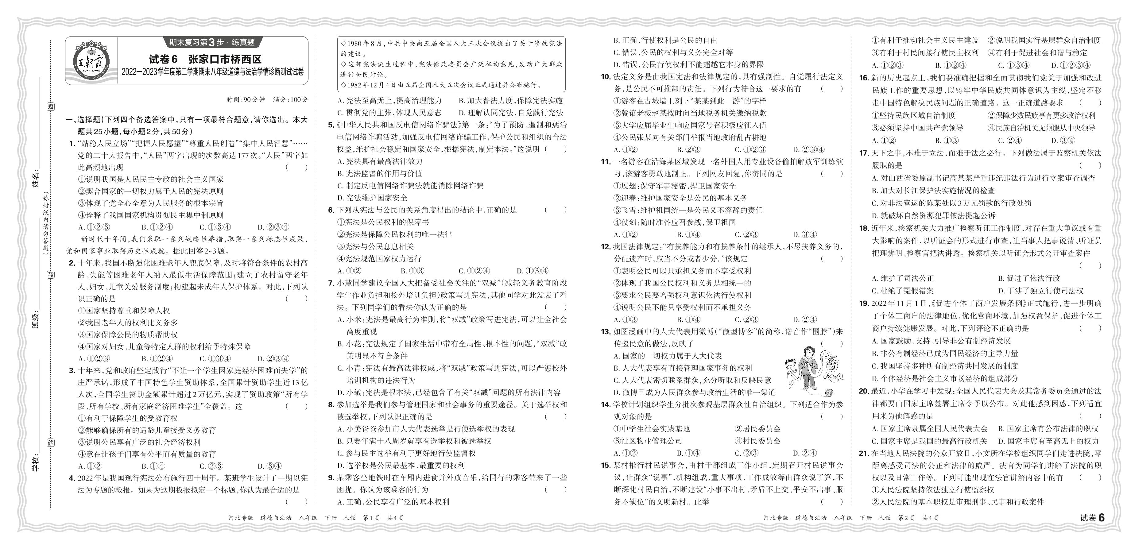 河北省张家口市桥西区2022-2023学年度第二学期期末八年级道德与法治学情诊断测试试卷(人教版)【6】