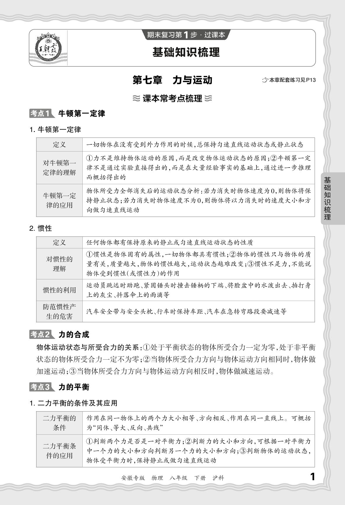 2024春下册八年级物理沪科版 期末过课本安徽版·基础知识梳理 第七章 力与运动