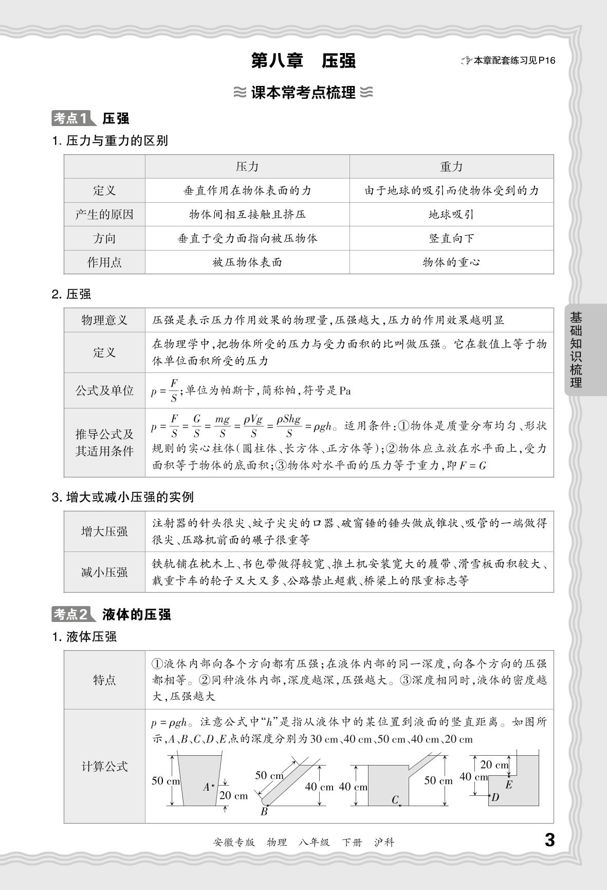 2024春下册八年级物理沪科版 期末过课本安徽版·基础知识梳理 第八章 压强