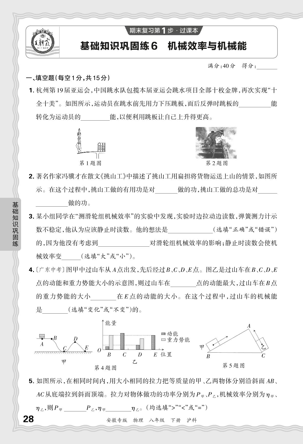 2024春下册八年级物理沪科版 期末过课本安徽版·基础知识巩固练 机械效率与机械能【6】