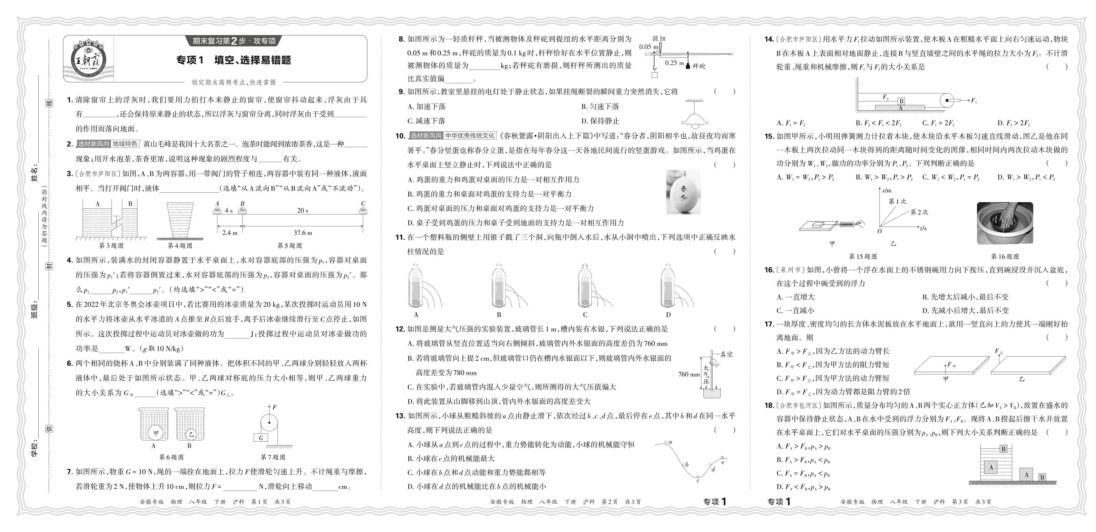 2024春下册八年级物理沪科版 期末专项卷安徽版·填空、选择易错题【1】