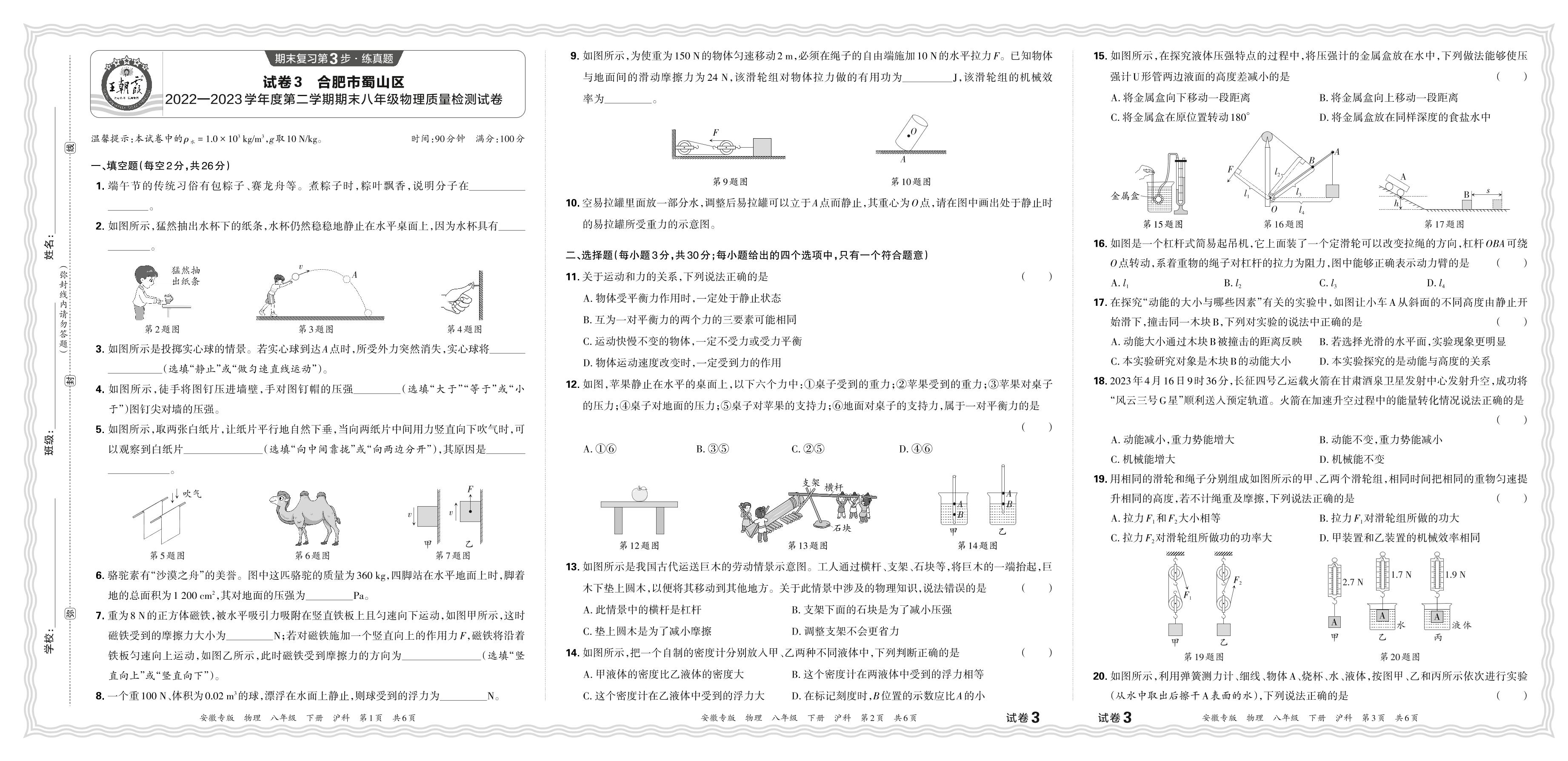 安徽省合肥市蜀山区2022-2023学年度第二学期期末八年级物理质量检测试卷(沪科版)【3】