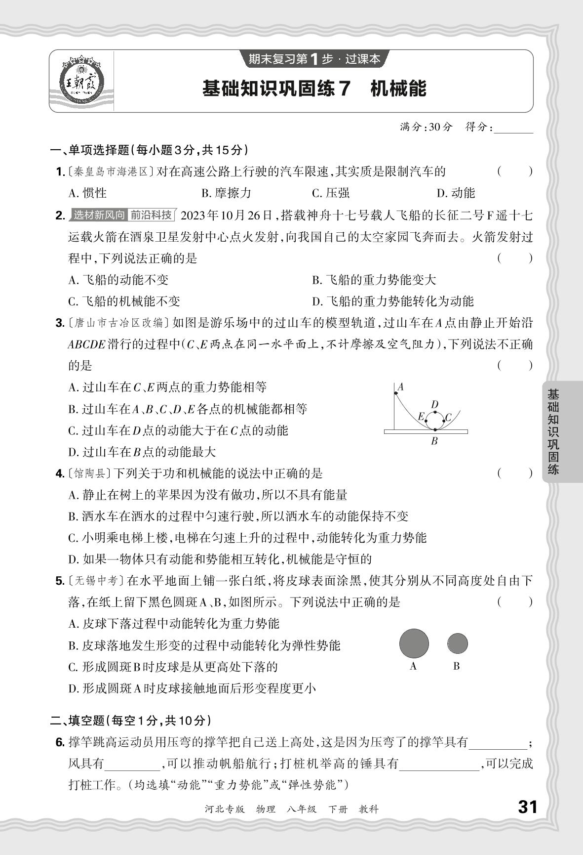2024春下册八年级物理教科版 期末过课本河北版·基础知识巩固练 机械能【7】