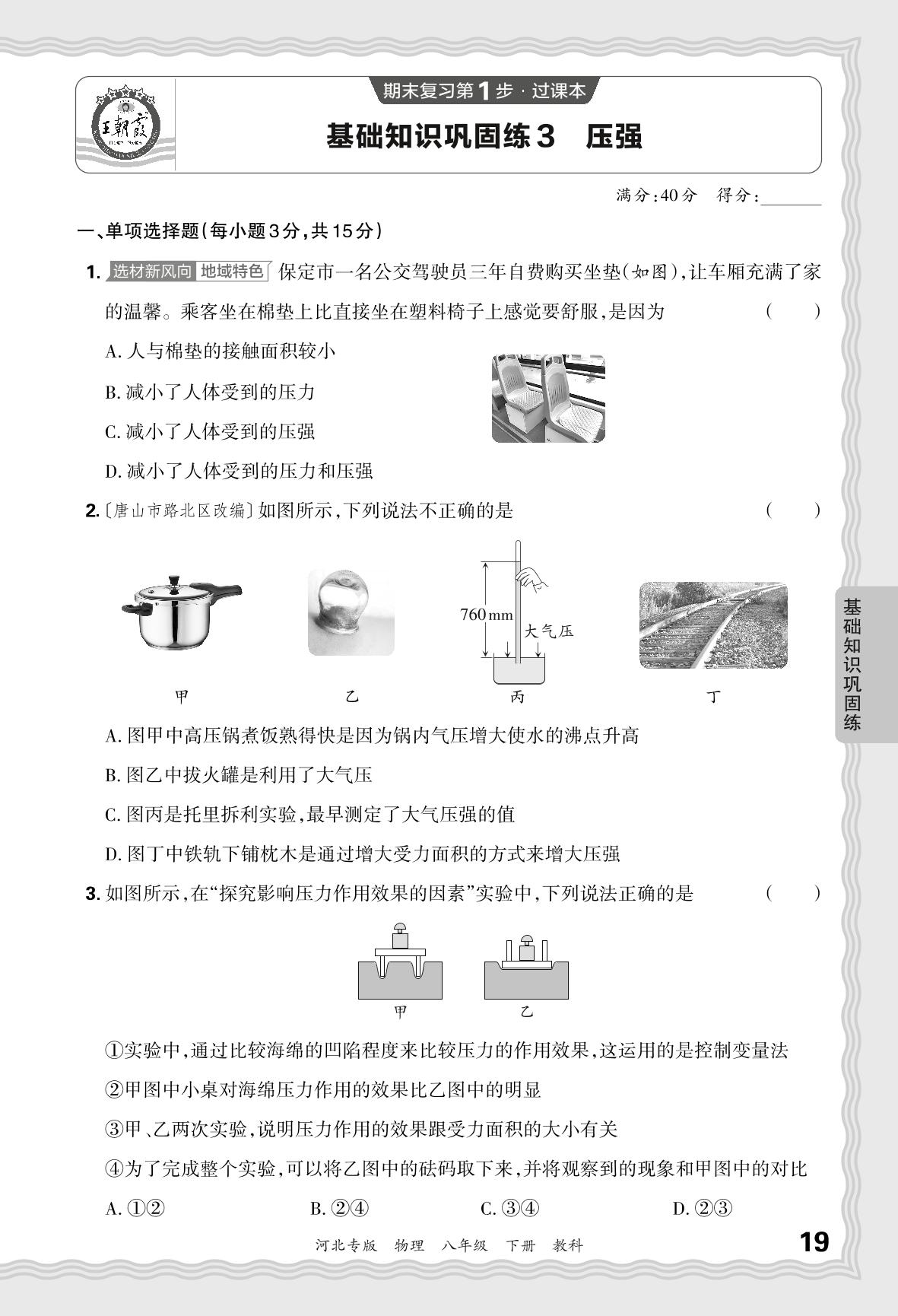 2024春下册八年级物理教科版 期末过课本河北版·基础知识巩固练 压强【3】
