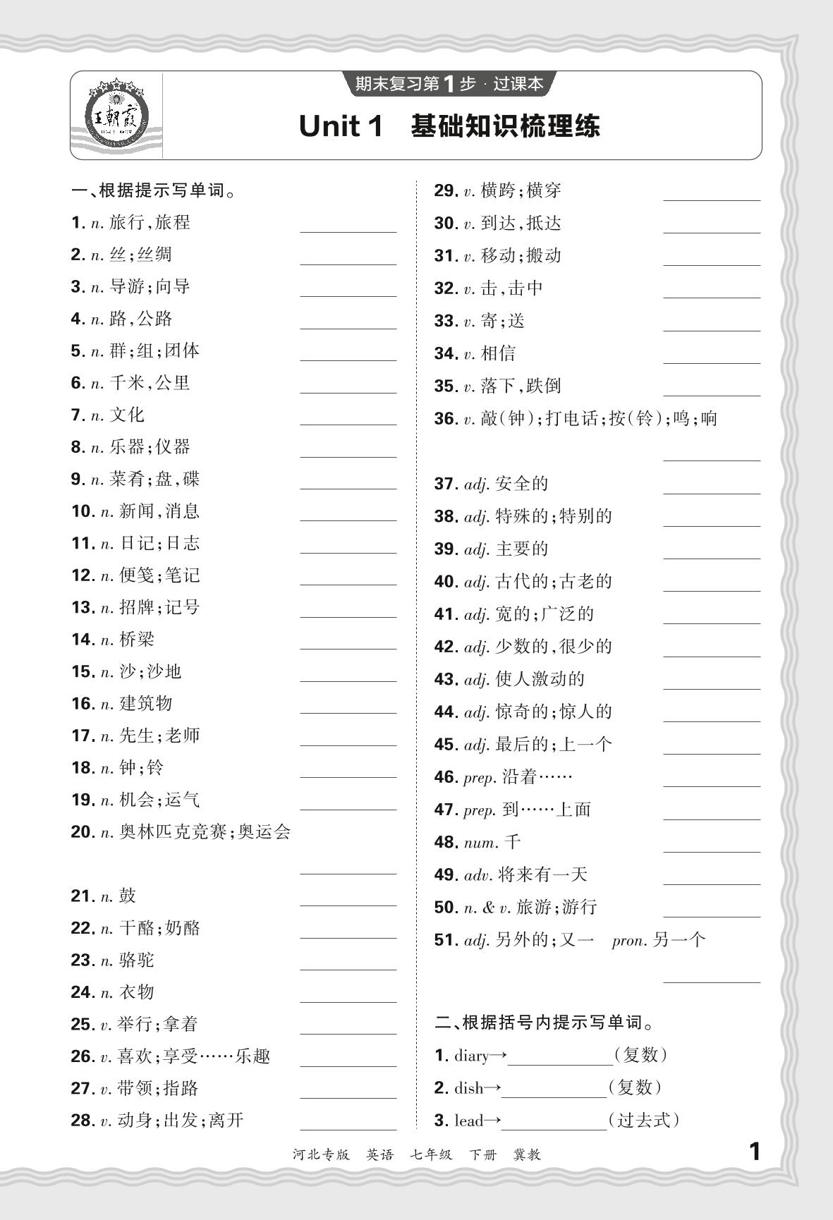 2024春下册七年级英语冀教版 期末过课本河北版·Unit 1 基础知识梳理练