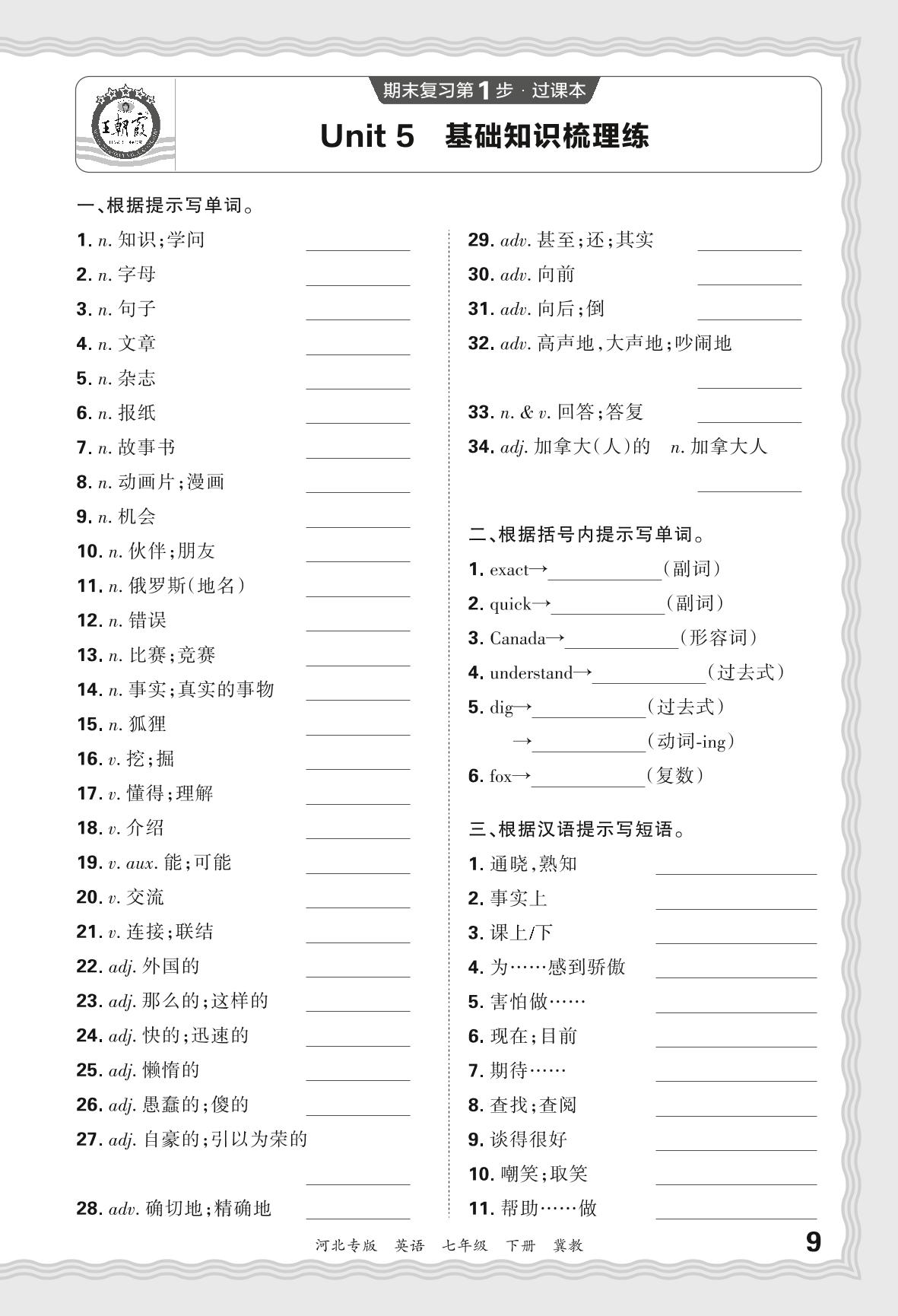 2024春下册七年级英语冀教版 期末过课本河北版·Unit 5 基础知识梳理练