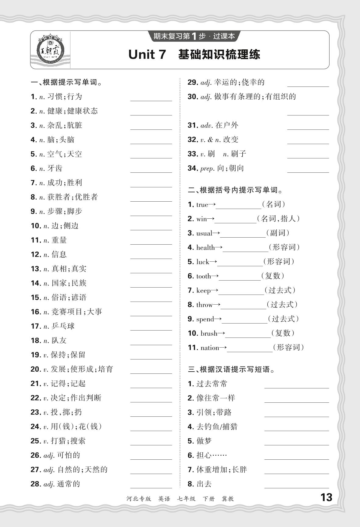 2024春下册七年级英语冀教版 期末过课本河北版·Unit 7 基础知识梳理练