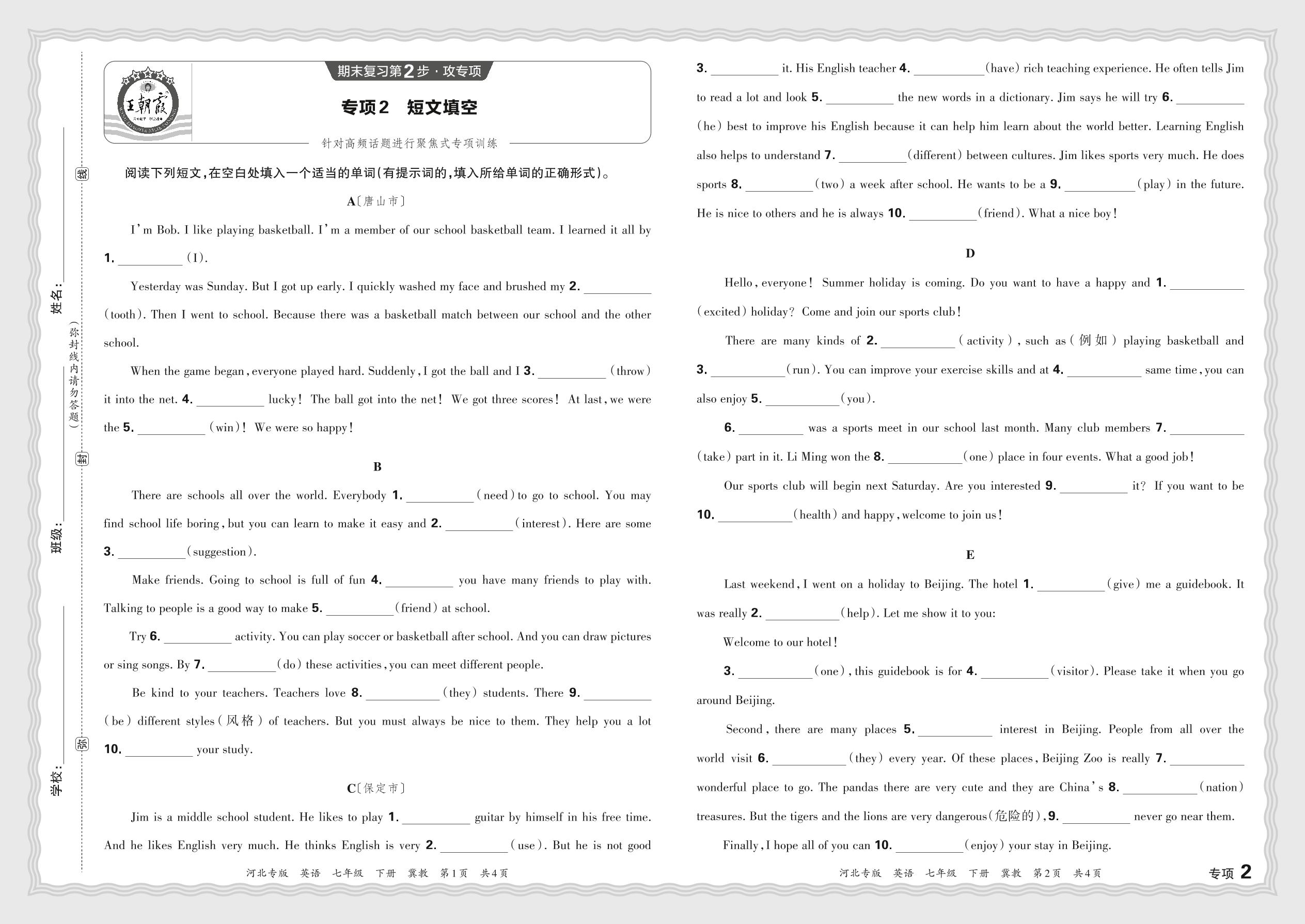 2024春下册七年级英语冀教版 期末专项卷河北版·短文填空【2】