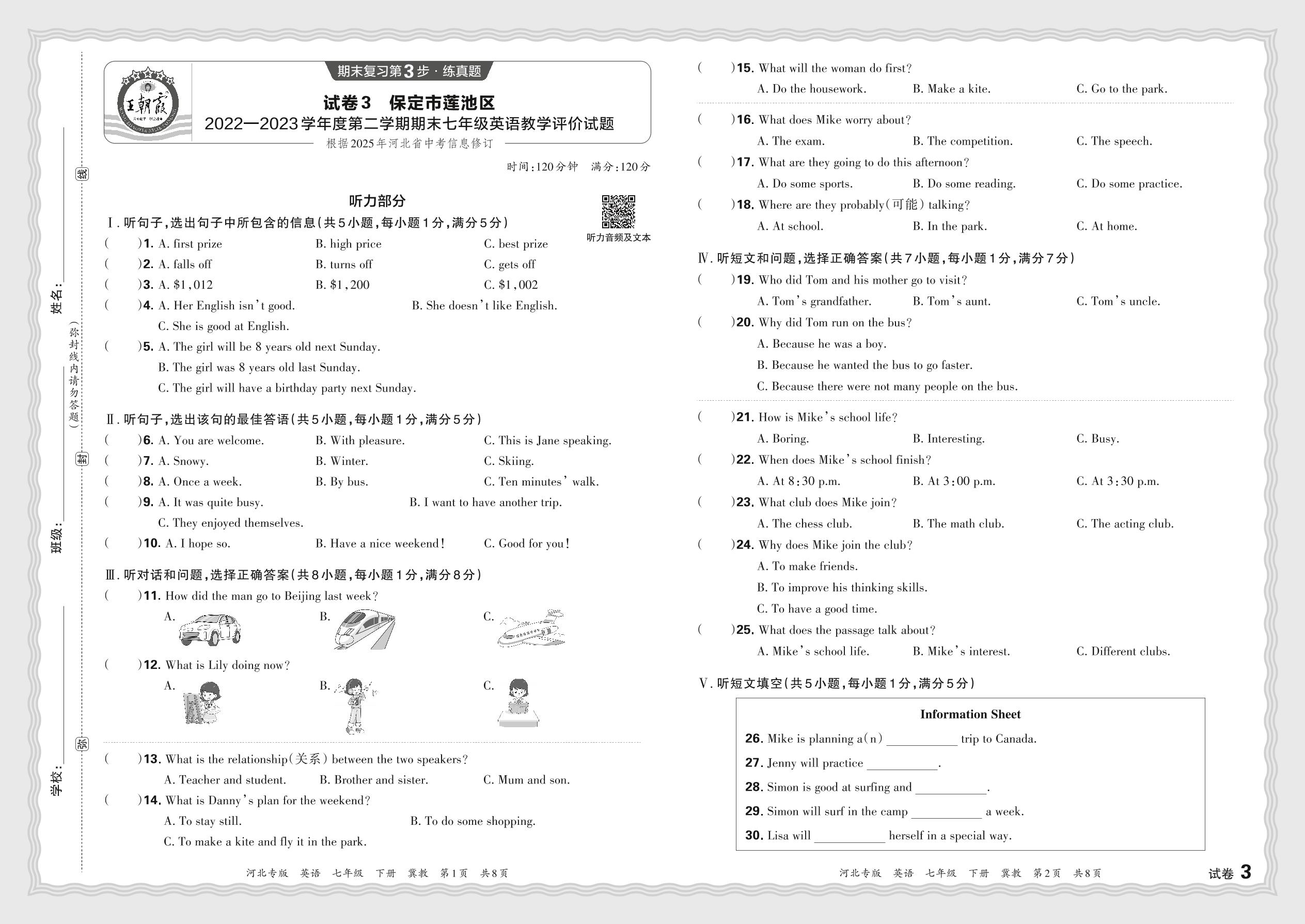 河北省保定市莲池区2022-2023学年度第二学期期末七年级英语教学评价试题(冀教版)【3】