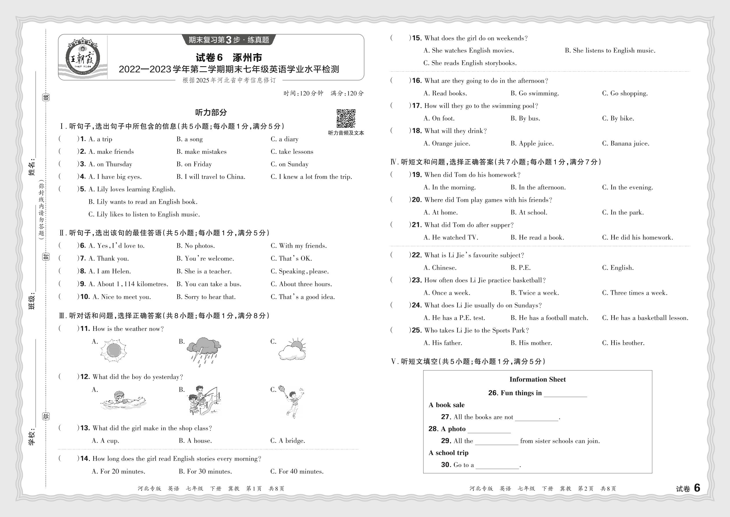 河北省保定市涿州市2022-2023学年第二学期期末七年级英语学业水平检测(冀教版)【6】