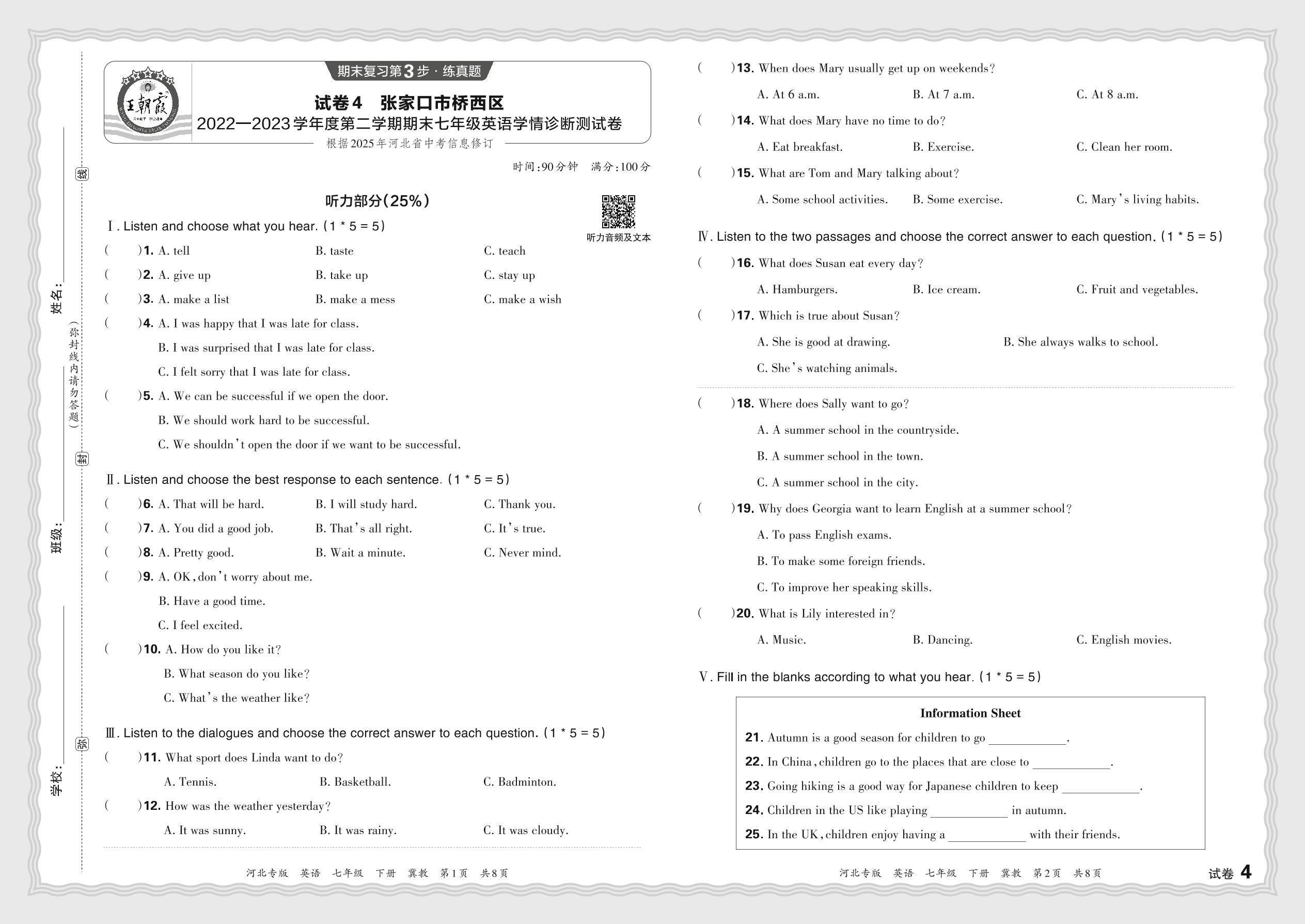 河北省张家口市桥西区2022-2023学年度第二学期期末七年级英语学情诊断测试卷(冀教版)【4】