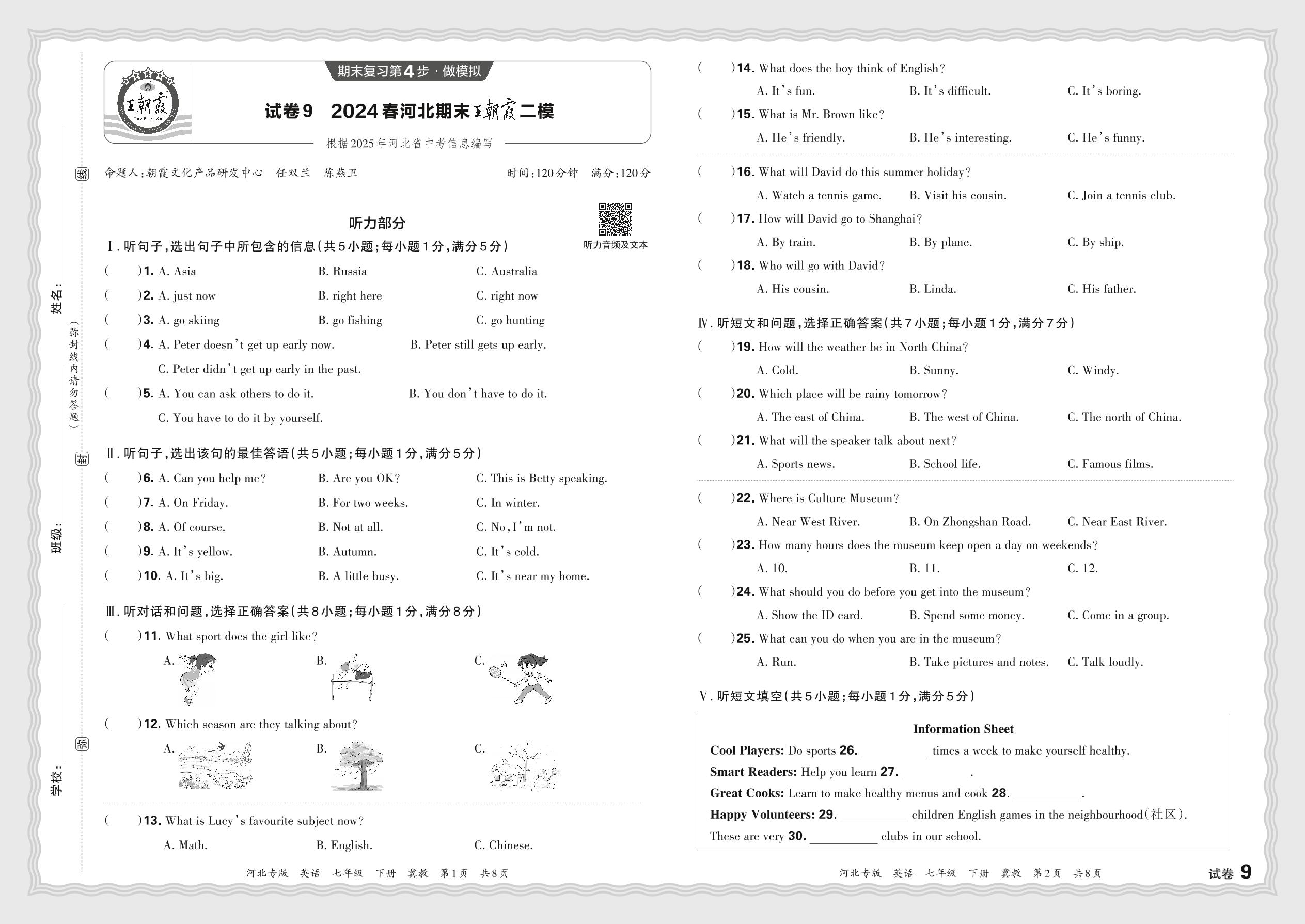 2024春下册七年级英语冀教版 河北期末王朝霞二模【9】